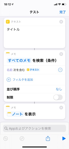 「メモを検索」の条件には、直接記述できるため、「テキスト」から渡す必要はなさそうです。