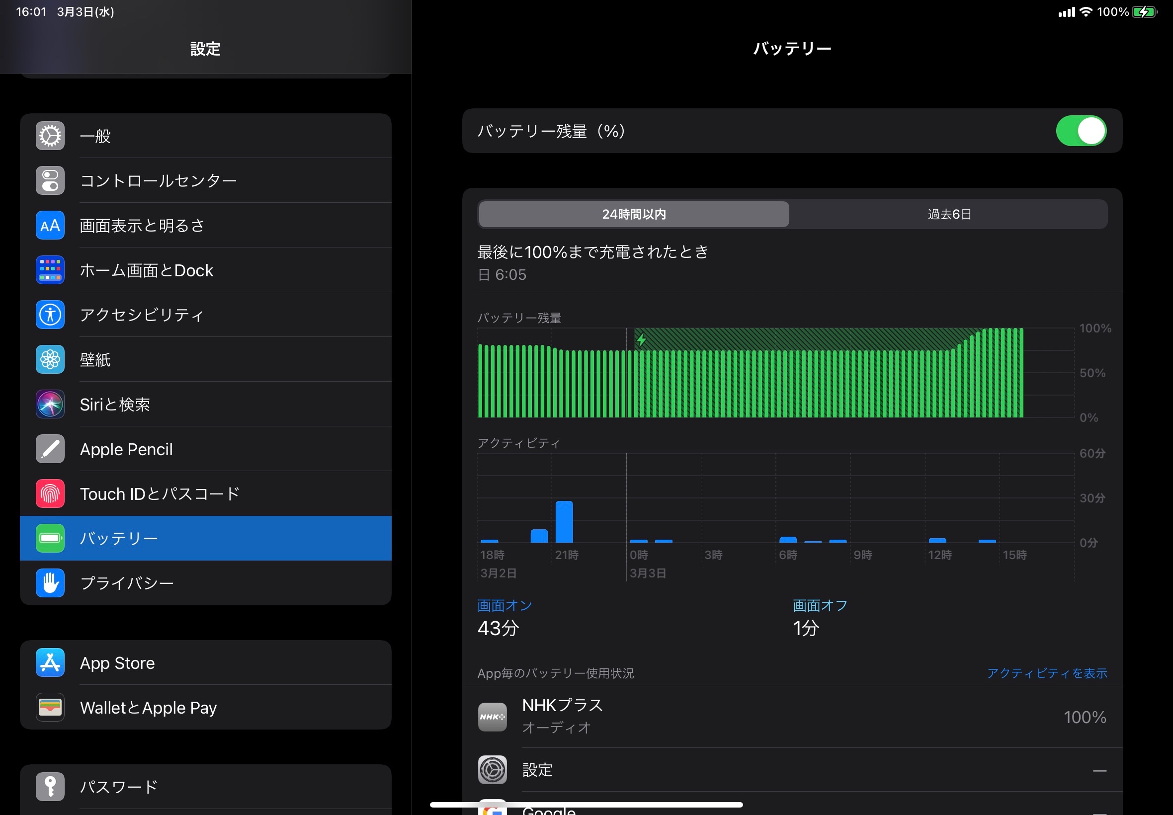 私の交換されて来たiPad Air4はその後、3月3日の1回だけ室温10℃から7℃で充電が遅い現象が確認出来ました(下写真)が、以降は特に問題なく充電出来ています。