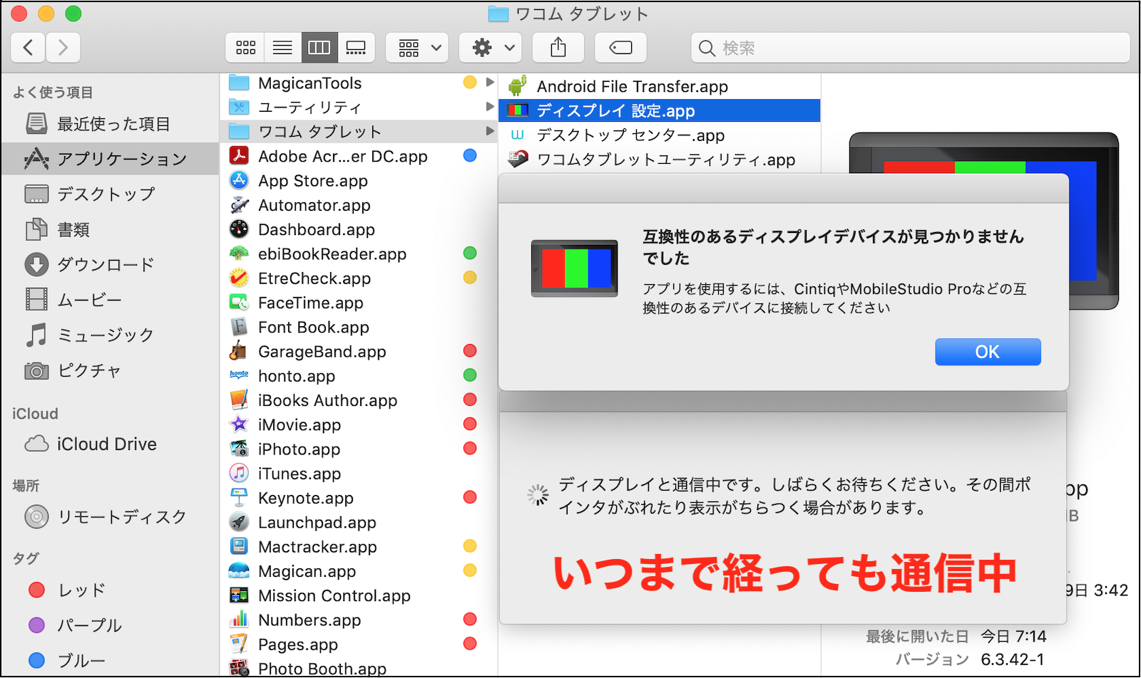 私の環境は、macOS Mojave(10.14.6)の MacBook Pro(Retina, 15-inch, Mid 2012)に、DVI-HDMI 変換アダプタを使用して、Cintiq 24HDT(6.3.42-1)と接続していますが、Cintiq 24HDT 自体は問題無く使用出来るのに、下の画像の様にコーペンちゃんさんと同様のエラーメッセージが表示され、いつまで経っても通信中のままで「ディスプレイ設定.app」が開けません。