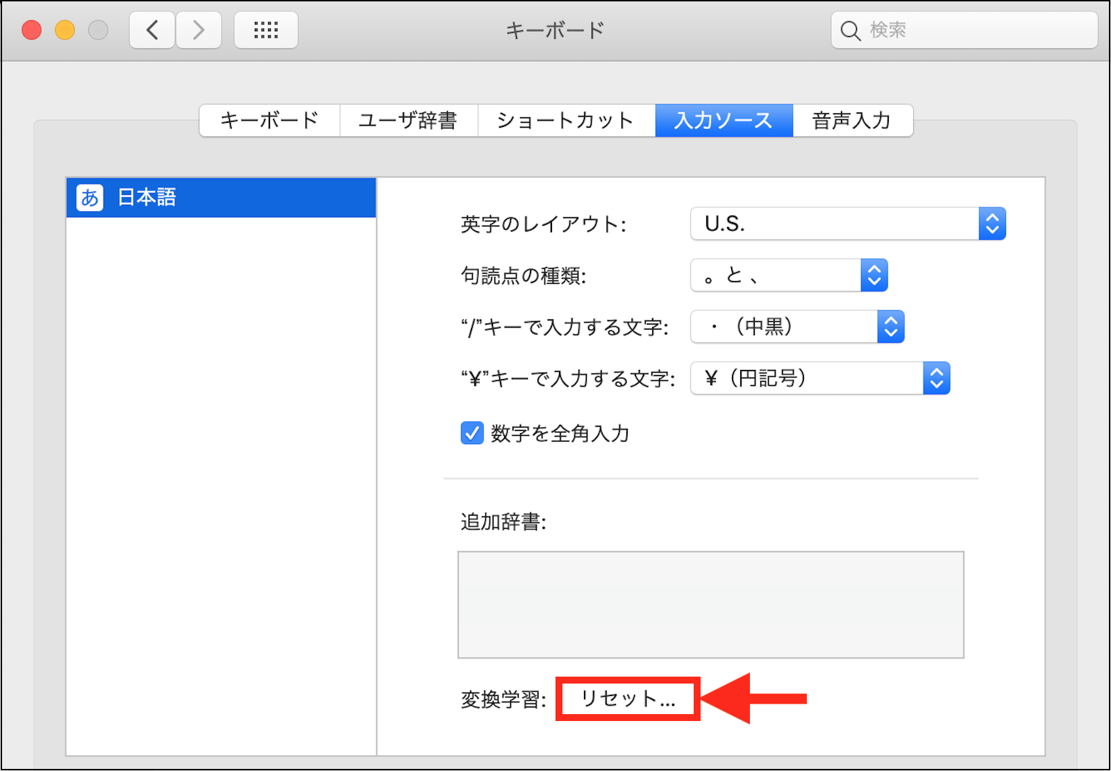 もし、「入力ソース」に macOS 標準の「日本語」をお使いの場合は、「変換学習」の「リセット」ボタンをクリックして、変換学習をリセット して見て下さい。