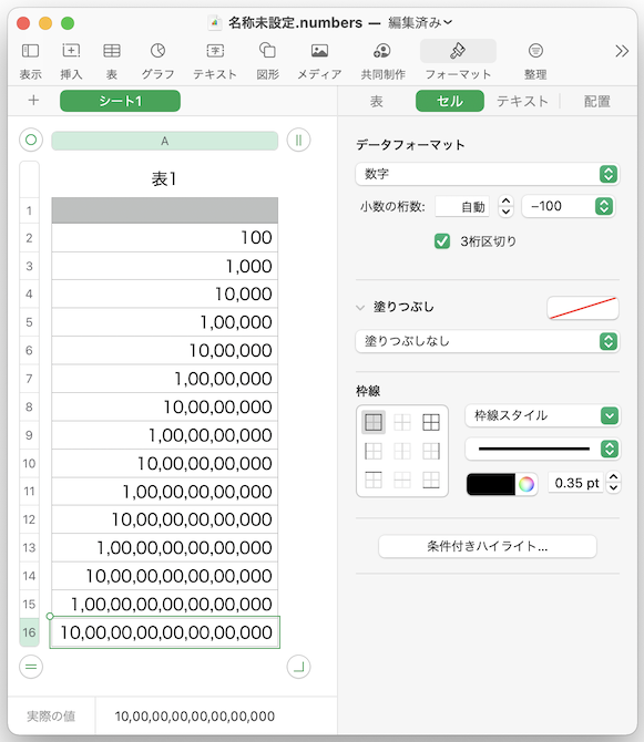 Numbersで「3桁区切り」にチェックを入れても2桁ずつに区切りが入ってしまう