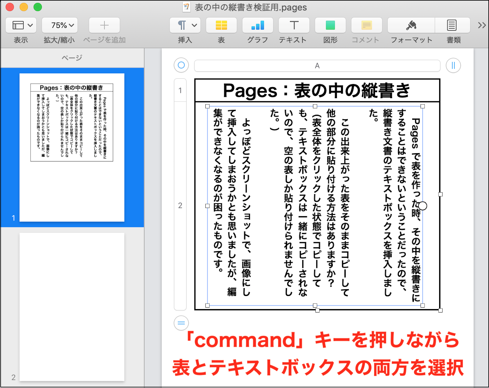 Pagesで表を作った時、その中を縦書きにすることはできないということだったので、縦書き文書のテキストボックスを挿入しました。この出来上がった表をそのままコピーして他の部分に貼り付ける方法はありますか?(表全体をクリックした状態でコピーしても、テキストボックスは一緒にコピーされないので、空の表しか貼り付けられませんでした。)