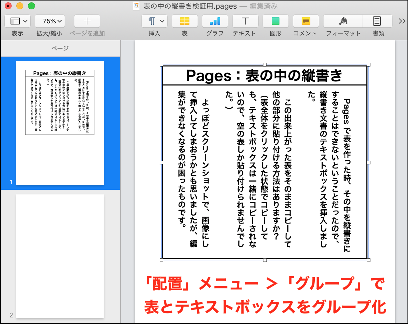 「配置」メニュー >「グループ」、または「option」+「command」+「G」キーで、表とテキストボックスをグループ化し、