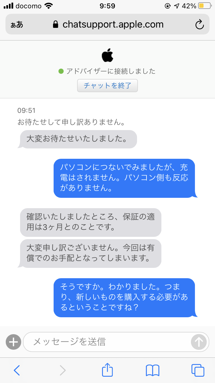 そして本日、まだ充電ができなくなりました。(見た目は破損しておりません)