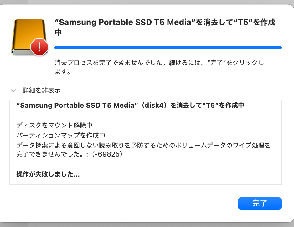 T5は以前はWindowsで使っていたので、Windowsで一度、フォーマットして中身を綺麗にしてから、MACに繋いで、再びフォーマットしようとしたのですが、フォーマット完了の前にエラーになってしまいます。