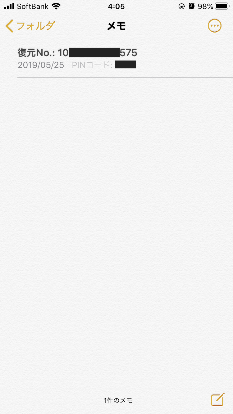 この1も開くと先ほどの復元ナンバーとPINコードが出てくるので、最近削除した項目欄が表れません。。泣
