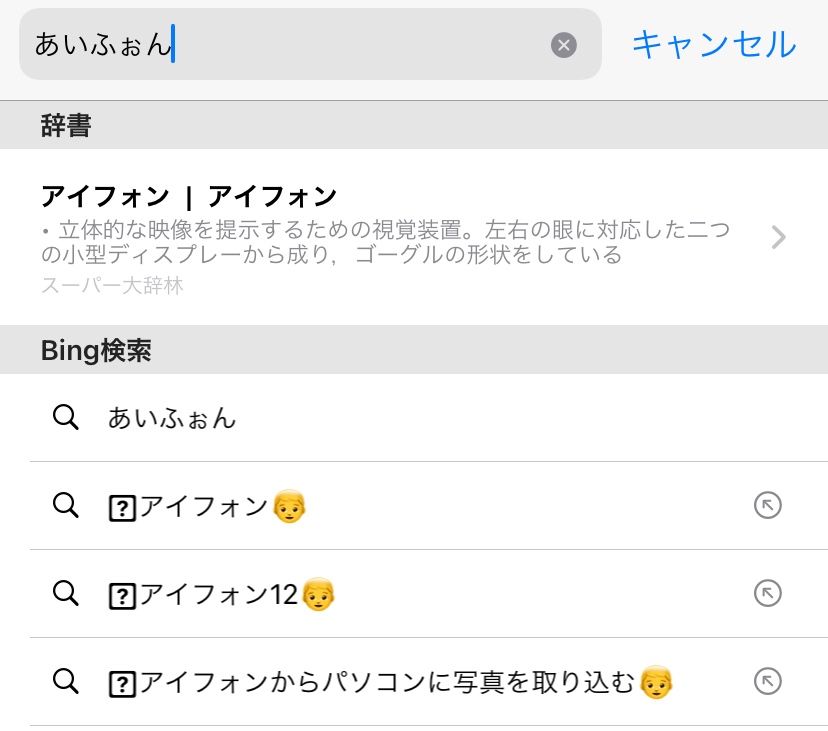 Safariにて検索しようとしたらこのように文字化けや顔文字が出てきてしまいます。
