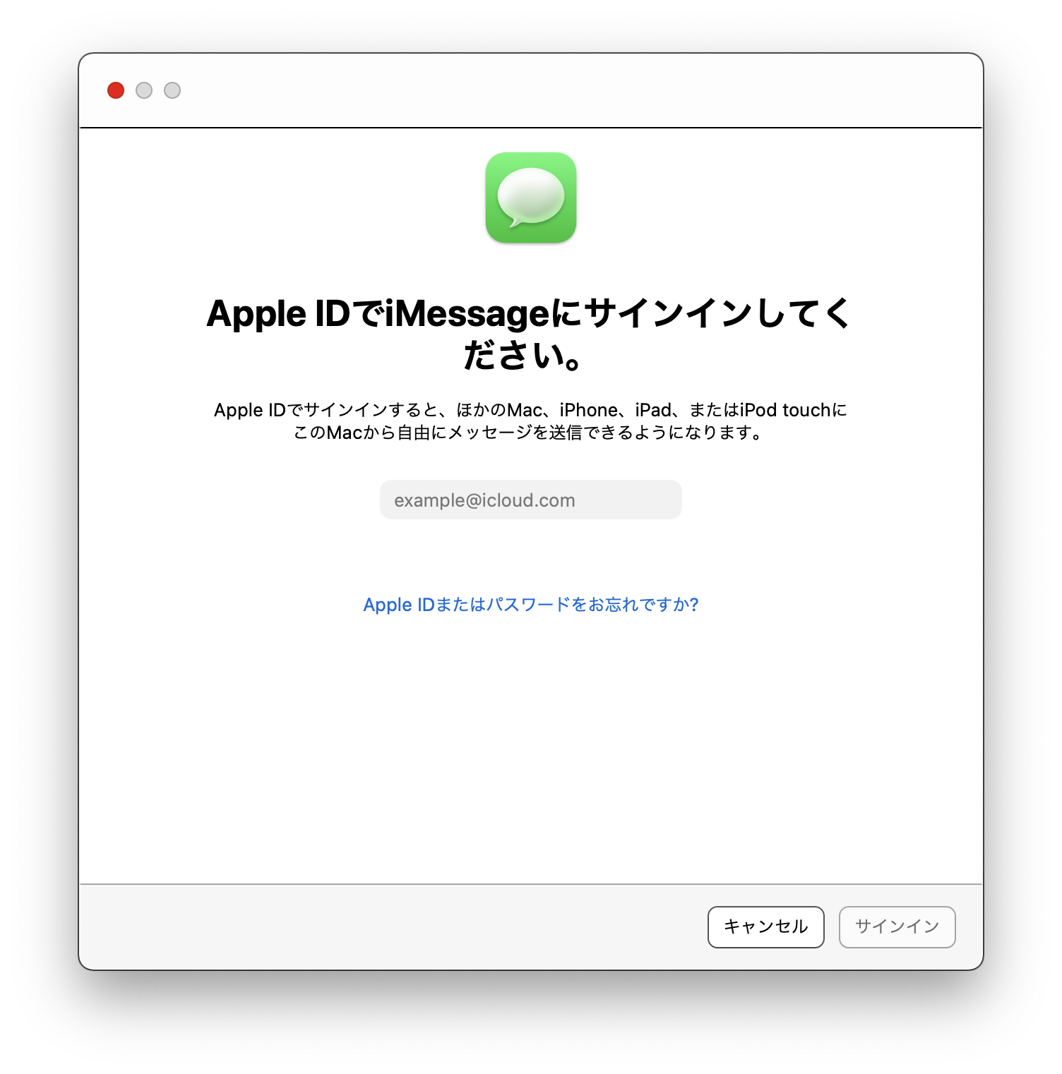 MacBookで、メッセージを立ち上げると、Apple IDでiMessageにサインインしてくださいと添付画像の表示がでるようになりました。