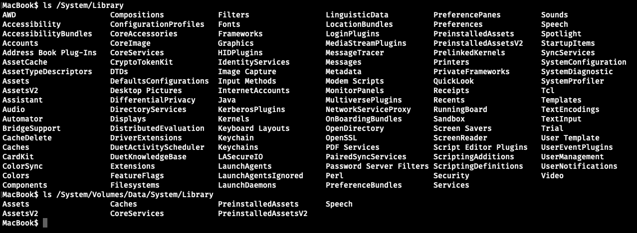 上位項目でまとめて、「/System/Library」と「/System/Volumes/Data/System/Library」の両方にあるものを揃えると、