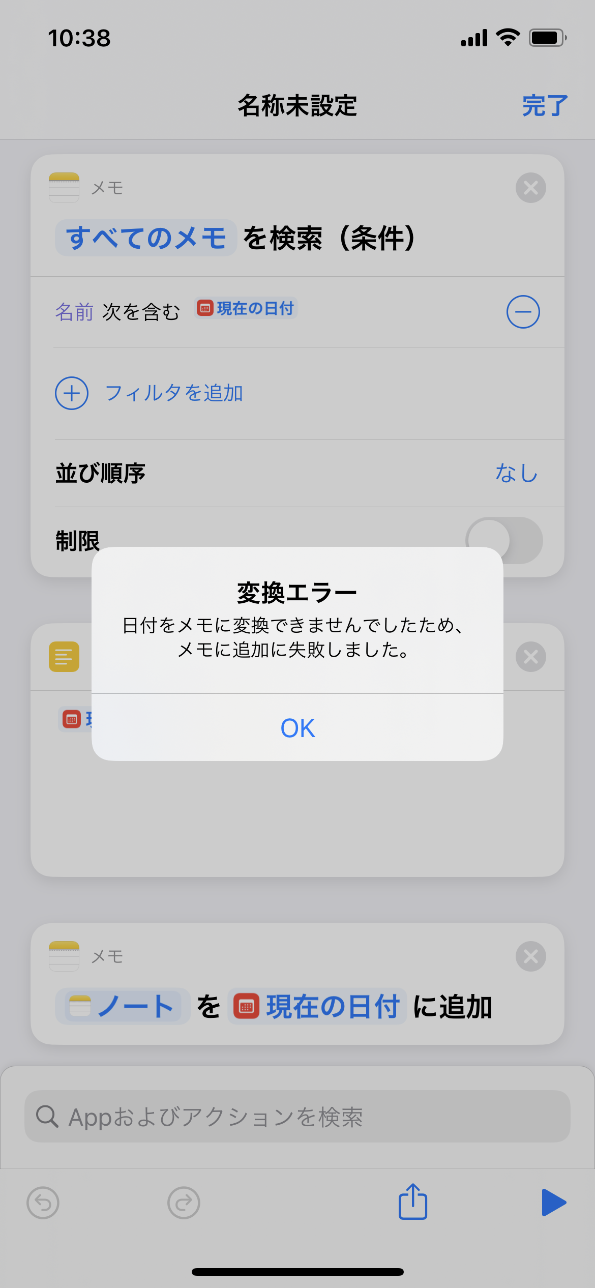 私は毎日1枚のメモにToDoやルーティンリスト、服薬時間を記録しています。2021/03/10(水)などとタイトルをつけています。服薬時間をいちいち記録するのが面倒だと思い、ショートカットアプリを使用しようと作成してみましたが、エラーが出てしまい、うまくいきません。