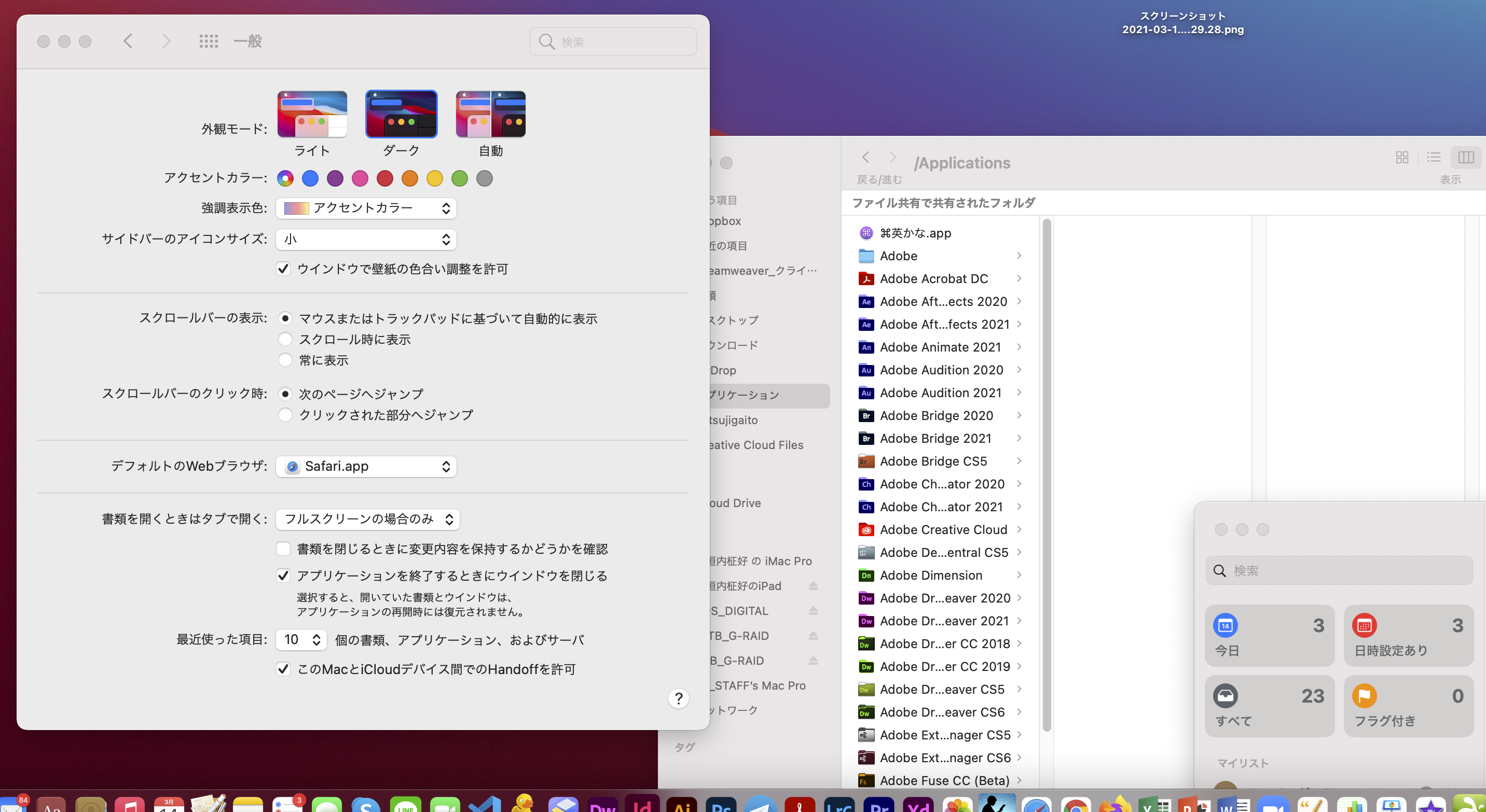 iMacPro(11.2.3)で使用しています。アップグレード前、いつからか定かではありませんが、ダークモードに設定しても、デフォルトの壁紙とドックが暗くなるだけで、他どの各アプリケーションの背景も暗くなりません。。。