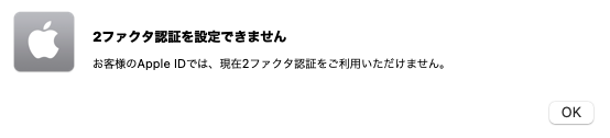 「システム環境設定」の「Apple ID」から「パスワードとセキュリティ」を選択して、2ファクタ認証を「有効にする」を行なったところ、「お客様のApple IDでは、現在2ファクタ認証をご利用いただけません。」というポップアップが出て先に進めません。