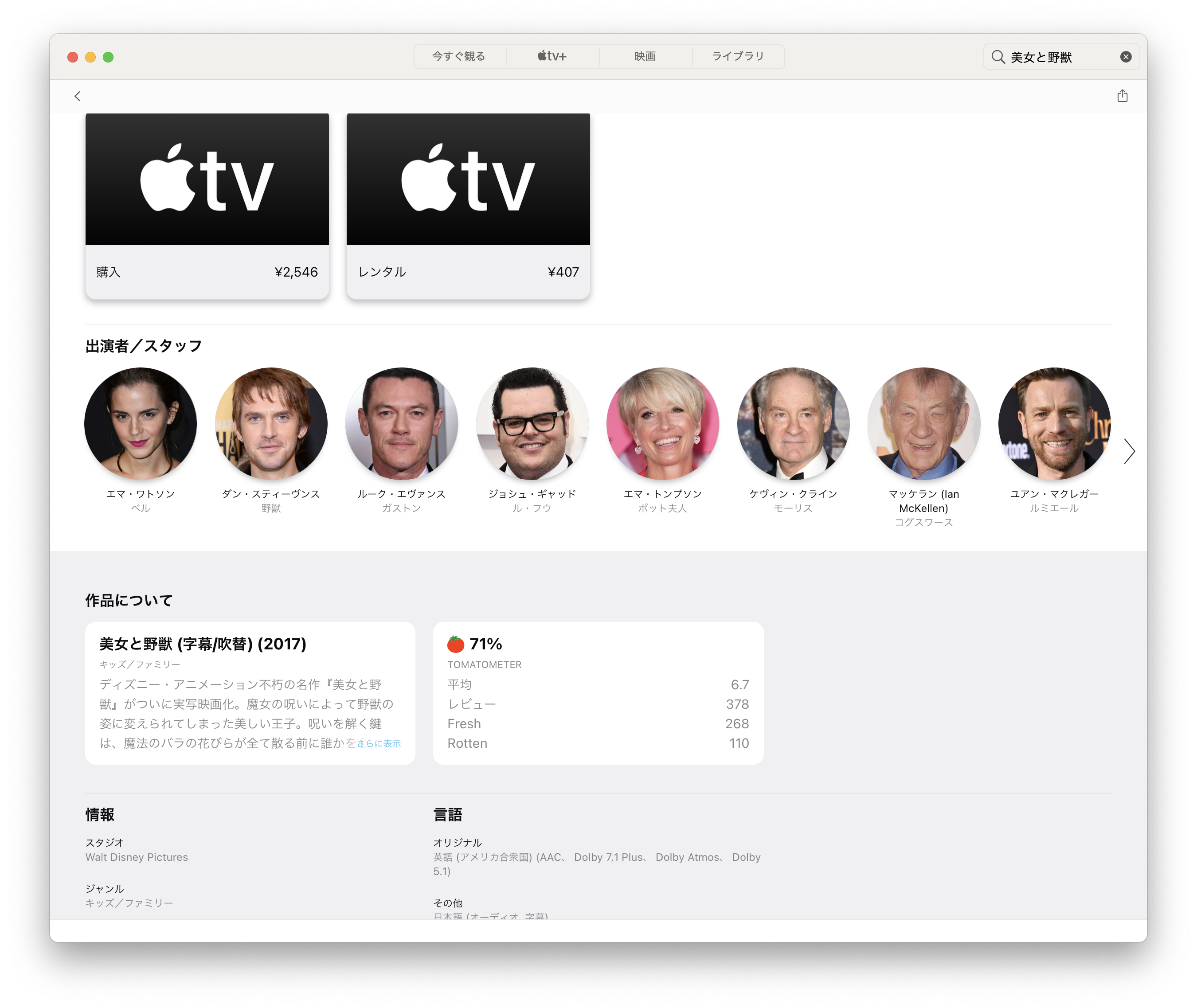ディズニー実写版「美女と野獣」:字幕/吹替版なので、日本語環境ならばデフォルトは<オーディオ>設定が<日本語>になっているはずですが、再生中に<日本語>または<英語>に選択可能。