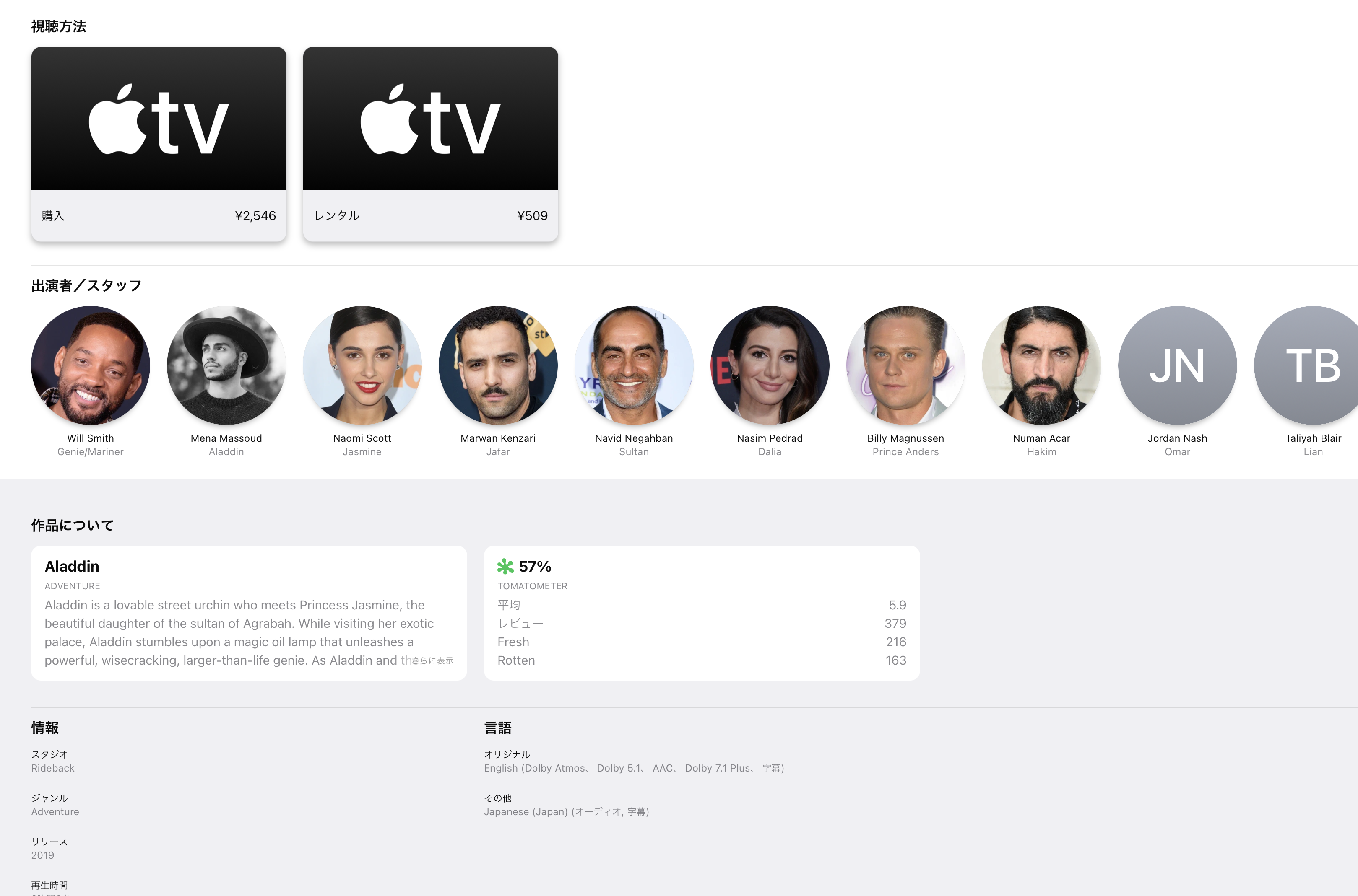 ディズニー実写版「アラジン」:字幕/吹替版なので、日本語環境ならばデフォルトは<オーディオ>設定が<日本語>になっているはずですが、再生中に<日本語>または<英語>に選択可能。