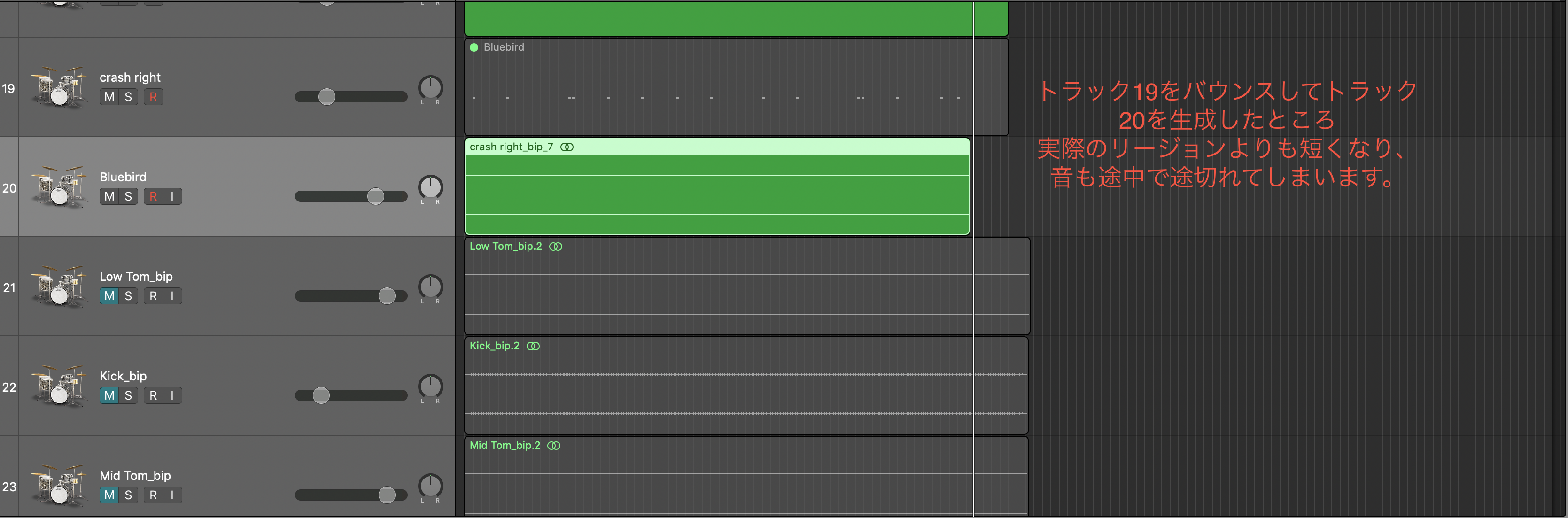 ・Crash Rightなどのトラックを選択し、[ファイル]-[バウンス]-[トラックを所定の場所に…]を選択してバウンスを実行すると、実際のリージョンの長さよりも短く作られ、音も途中で切れてしまう