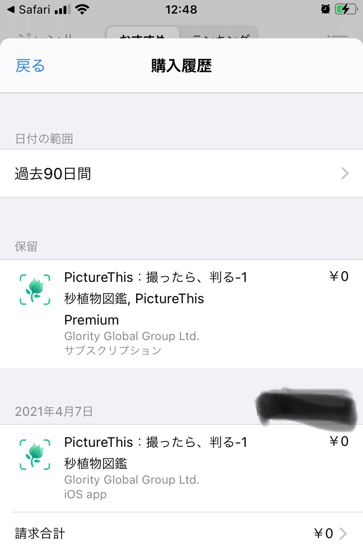 App購入履歴を確認すると、アプリをダウンロードした日付がある行の詳細は請求金額欄は¥0.ですが、もう一段上の詳細行は、日付欄に「保留」、ただの金額として¥0とあります。無料トライアル期間中かつ請求額¥0にて、アプリを削除しましたが、「保留」というものが無料トライアル中という意味であれば、期間後に課金されてしまうのでしょうか。App IDのサブスクリプション明細のPicture This Premium は「有効」「2021年4月@@日に終了予定」となっています。
