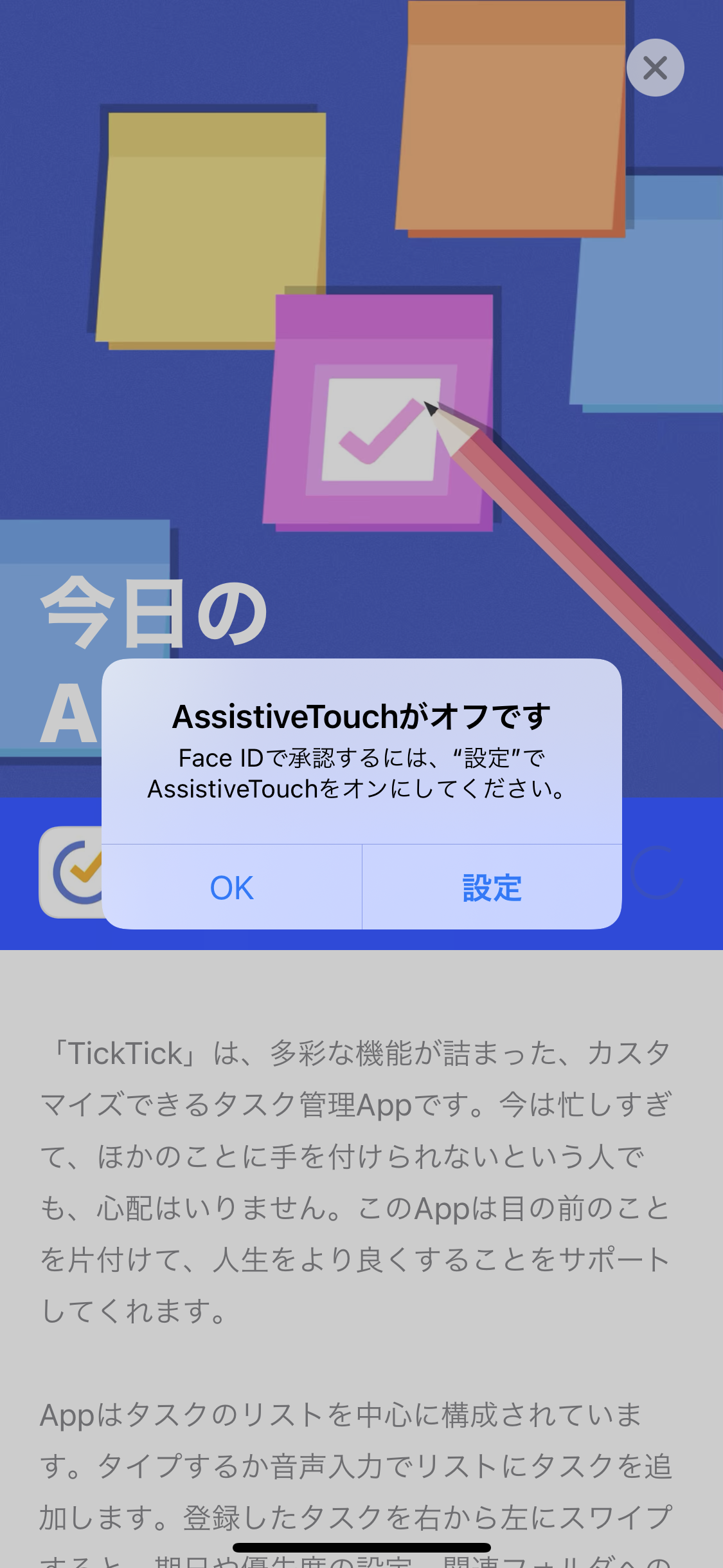 アプリのダウンロードを行おうとするとassistive touch をオンにして下さいと表示されます。これまでは、Face IDですぐにダウンロードできたのに、アプリがダウンロード出来なくなりました。トリプルクリックでAssistiveTouchを出して対応しようとしているのですが、とても不便です。解決方法を是非教えて頂けますか。