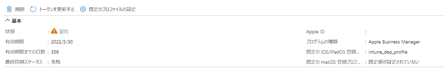 DEPトークンの更新期限になり、ABMよりトークンを取得し、その後Intune側でトークンを更新しました。