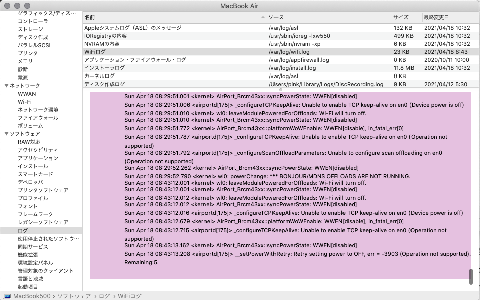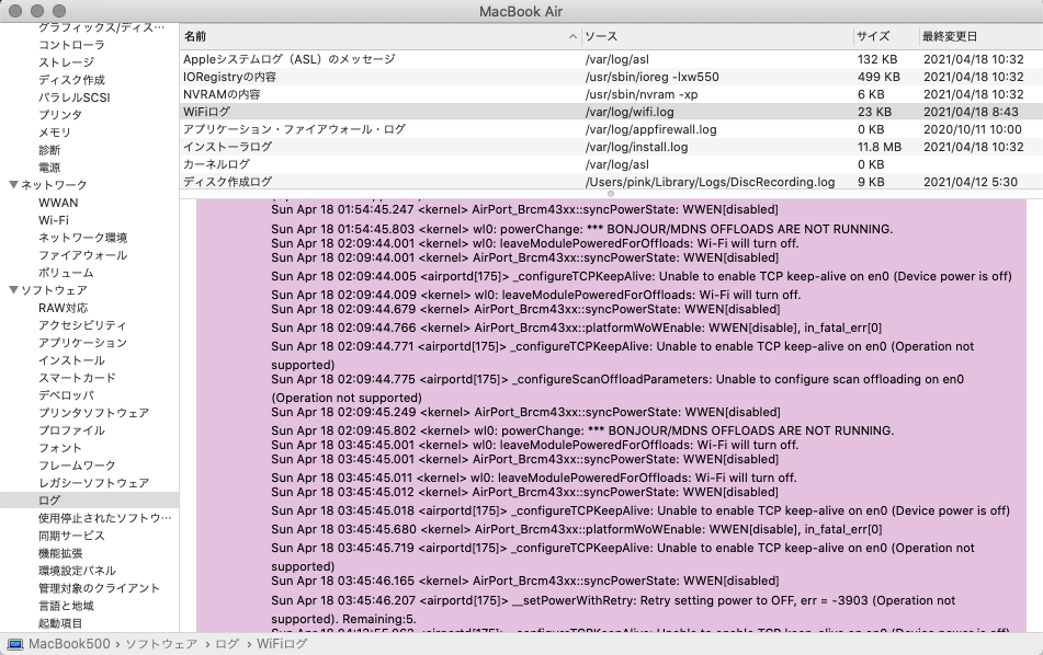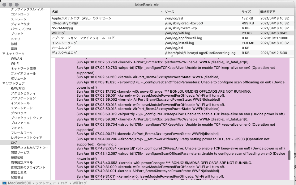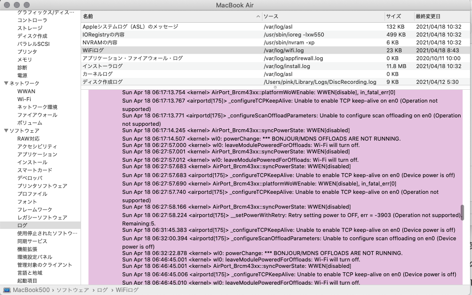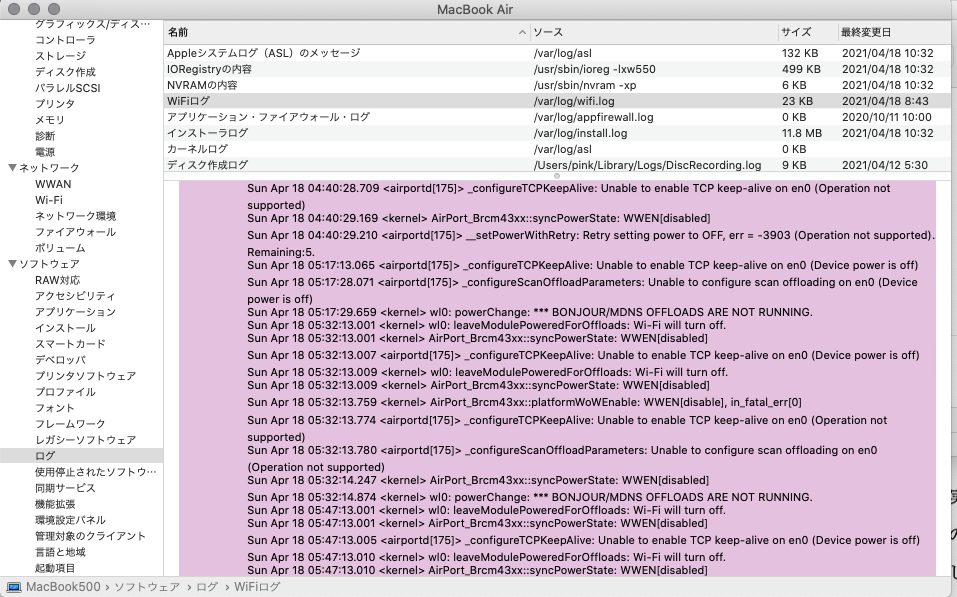 例えば下記は、OSI4層のTCPのキープアライブをオンにしようとしたけれど、OSI1層のデバイス(=Wi-Fi)の電源が入っていないため、できなかったというログです。Wi-Fiを繋ごうとはしていません。