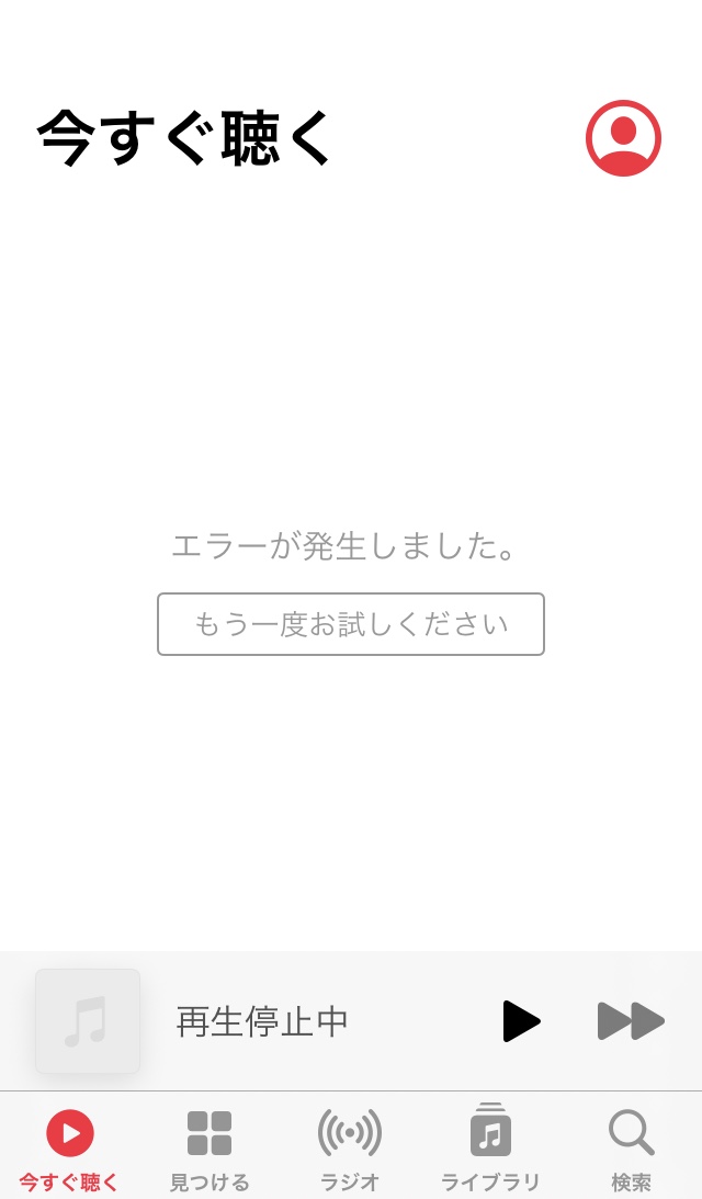 Apple Musicの「今すぐ聴く」が1ヶ月程前に突然下のように表示され、「もう一度お試しください」を何度押しても先に進みません。再インストール、再起動、iCloudからのサインアウトも試しましたが、何も変化しませんでした。他の「見つける」や「Radio」などの機能は普通に使えます。