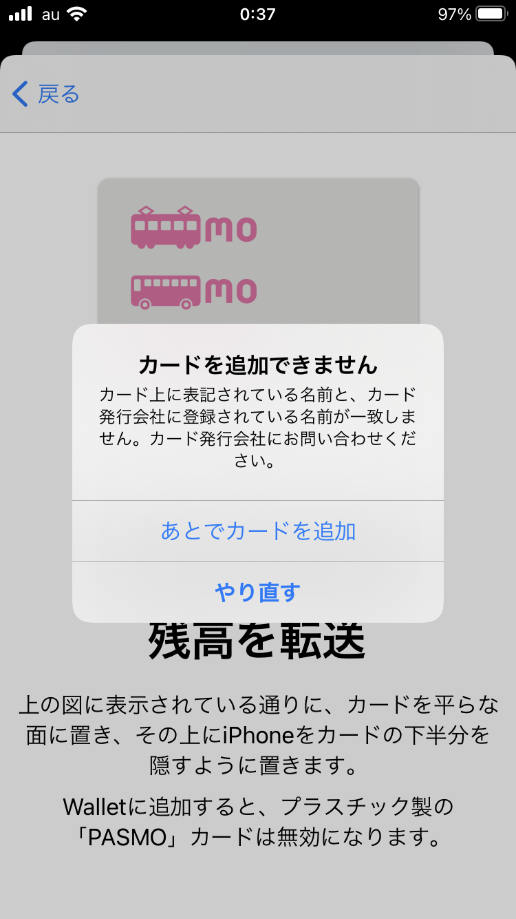 iPhoneSE2のApplePayにPASMO通勤定期を読み込みすると画像のようなエラーがでます。