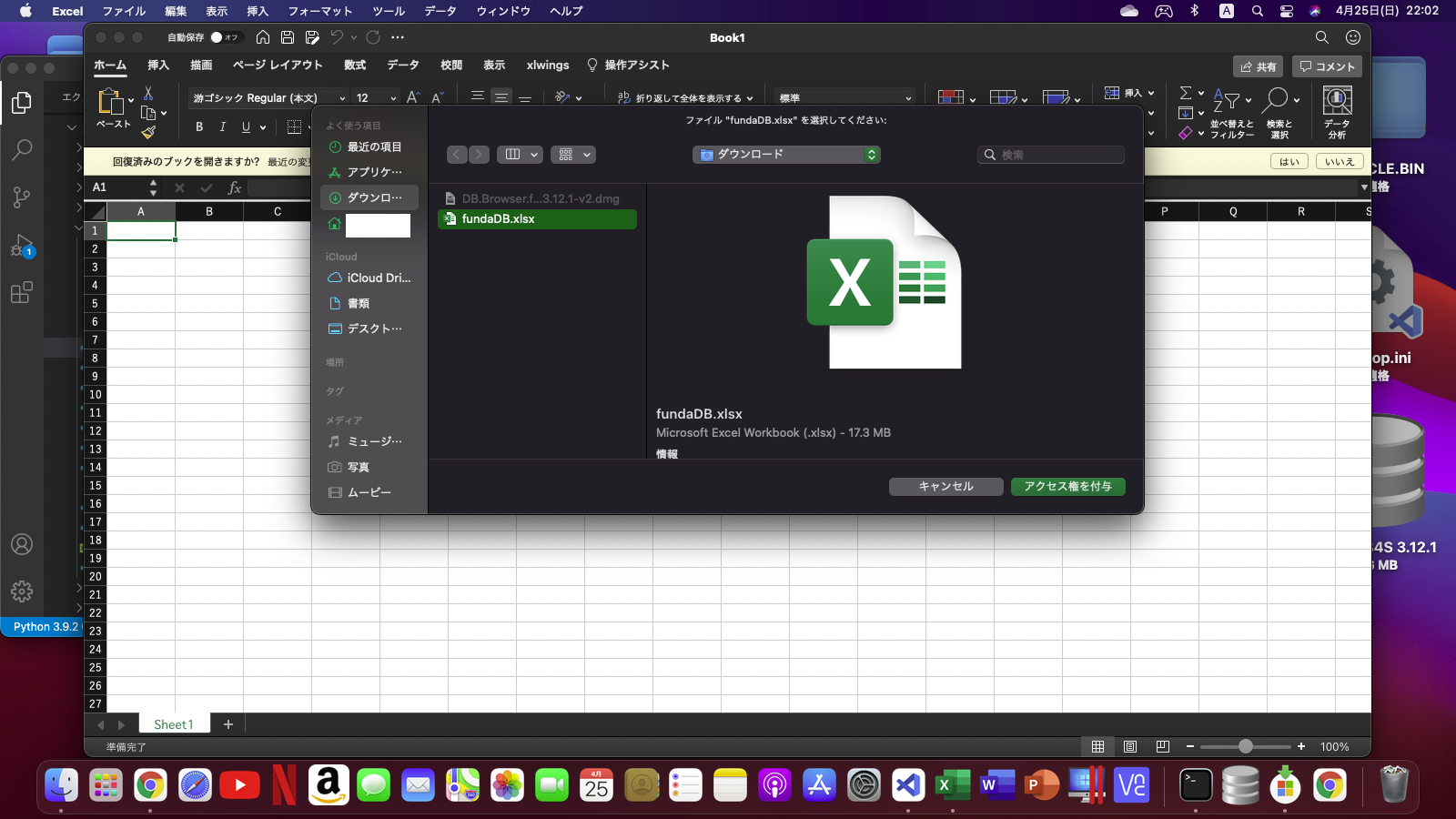 m1mac miniでpythonを使ってエクセル(v16.48)を自動実行するプログラム組んだのですが、xlwingsで組んだ部分の起動時に「アクセス権を付与」というメッセージが毎回出てとまってしまいます