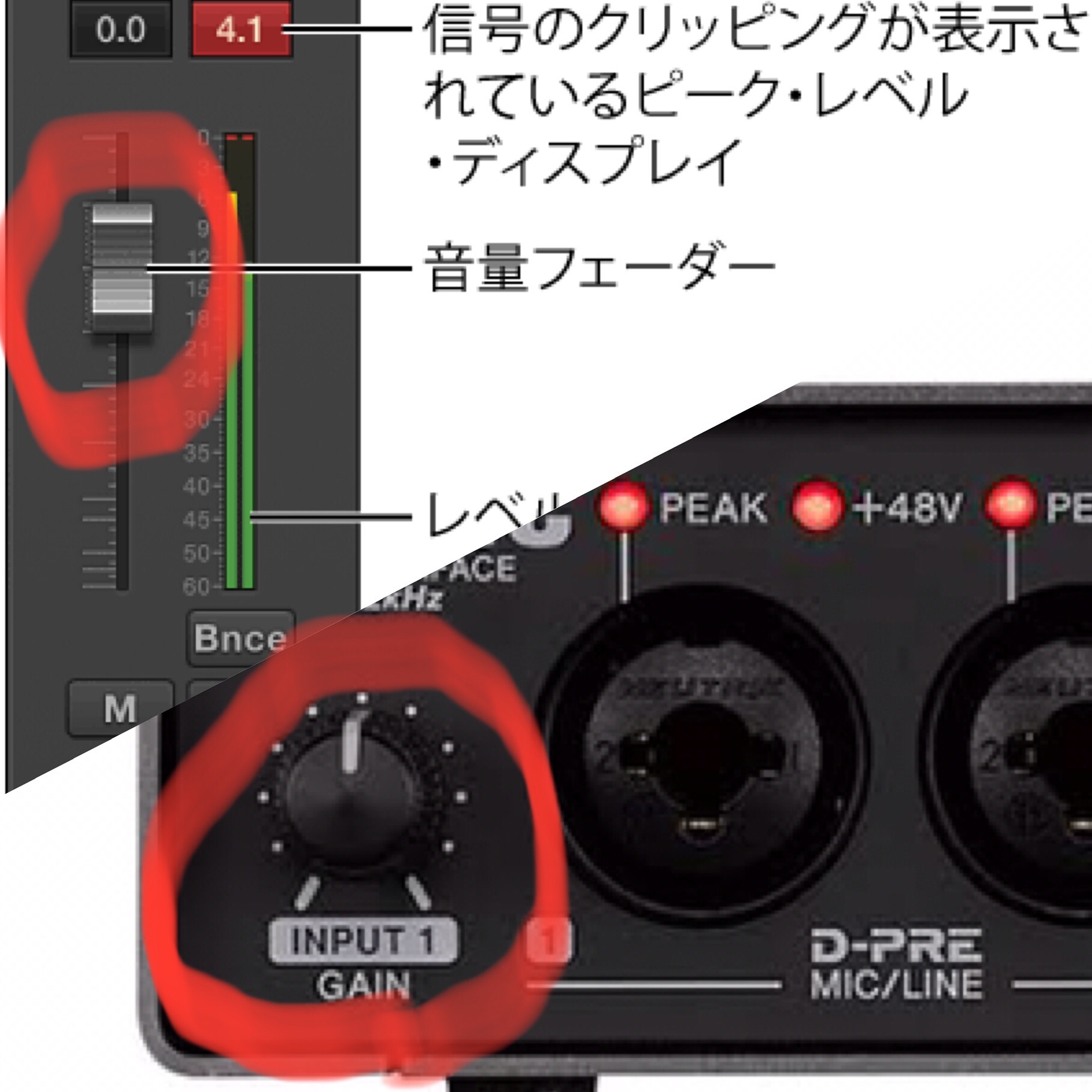「オーディオインターフェースのについているGAINのツマミ」で”音割れ”しないように録音してください。