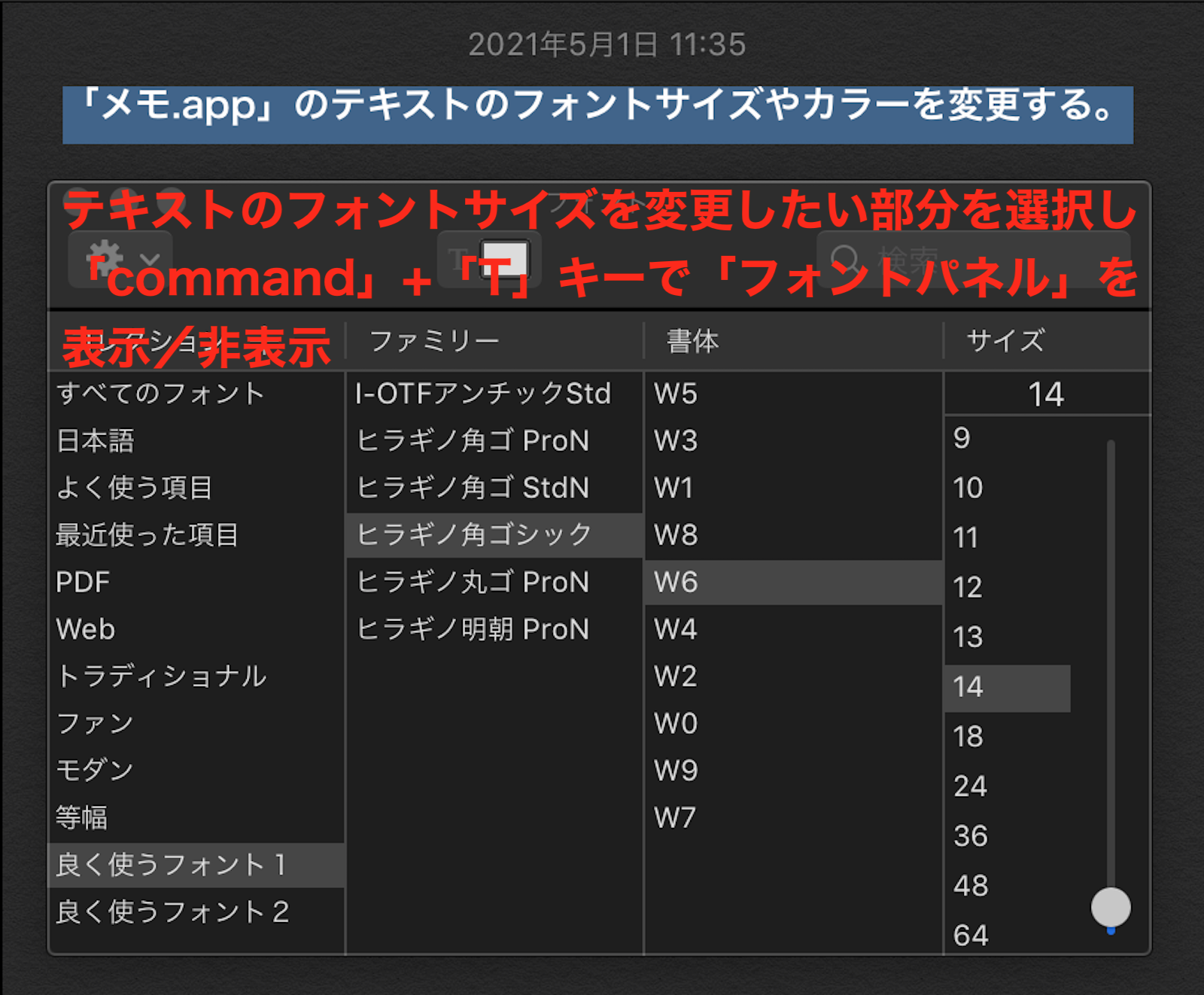 下の画像の様に、テキストのフォントサイズを変更したい部分を選択し、「command」+「T」キーで「フォントパネル」を表示させ、変更したいフォントや書体、フォントサイズ等を選択します。