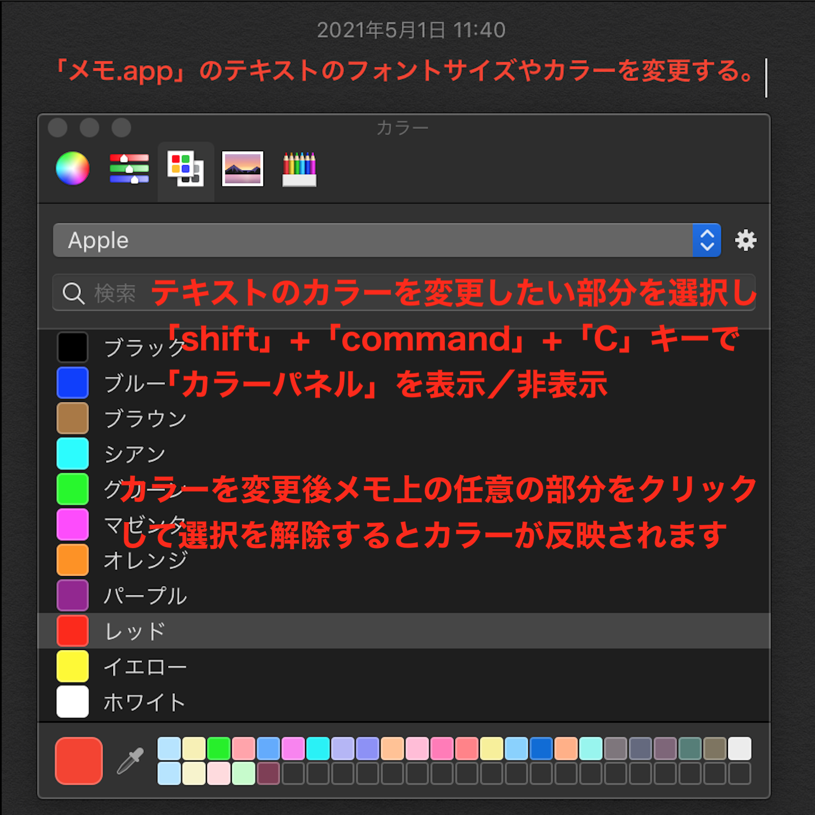 下の画像の様に、テキストのカラーを変更したい部分を選択し、「shift」+「command」+「C」キーで「カラーパネル」を表示させ、変更したいカラーを選択後、メモ上の任意の部分をクリックしてテキストの選択を解除すると、カラーが反映されます。