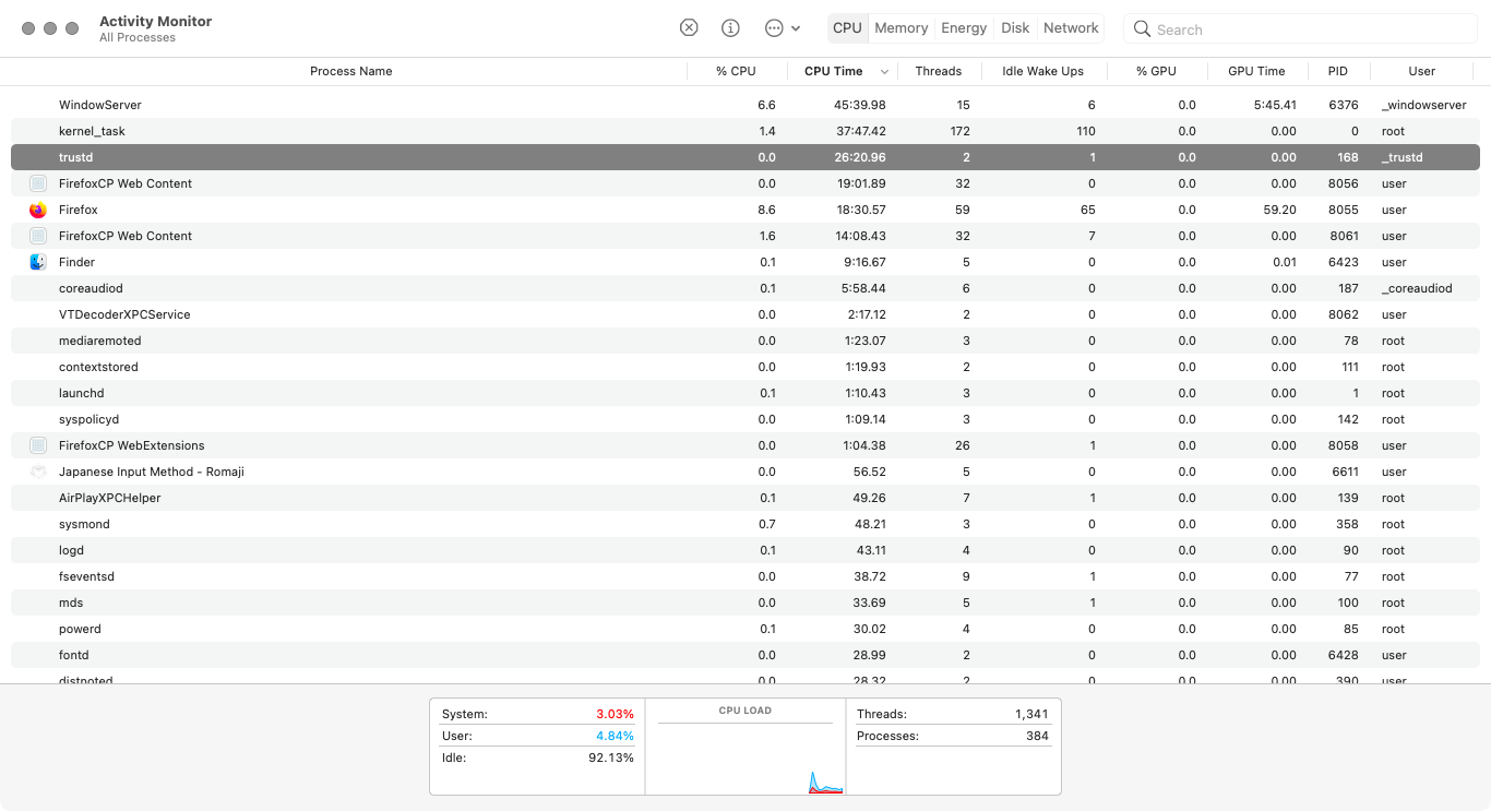 私の環境(macOS 11.3.1)では今朝?から Mac を起動してしばらくすると trustd が暴走していたのですが App Store からサインアウトして事なきを得ました。現在様子見です(なので Twitter で見かける? Google Chrome 犯人説は今のところ保留。インストールはしてますが)。
