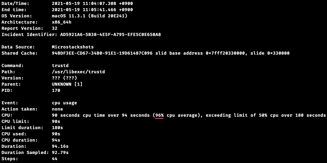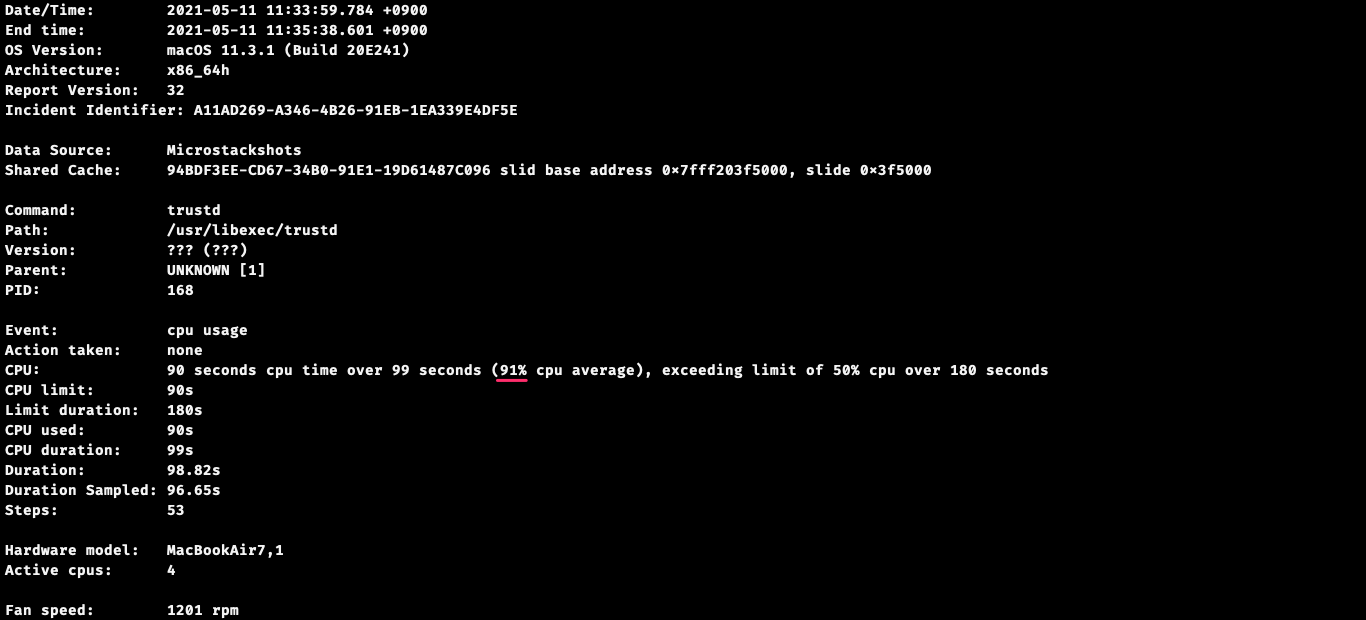 下記のリンク先の人は May 5, 2021 11:41 PM からのようです。そういえば数日前にも trustd が暴走したことがあったような?