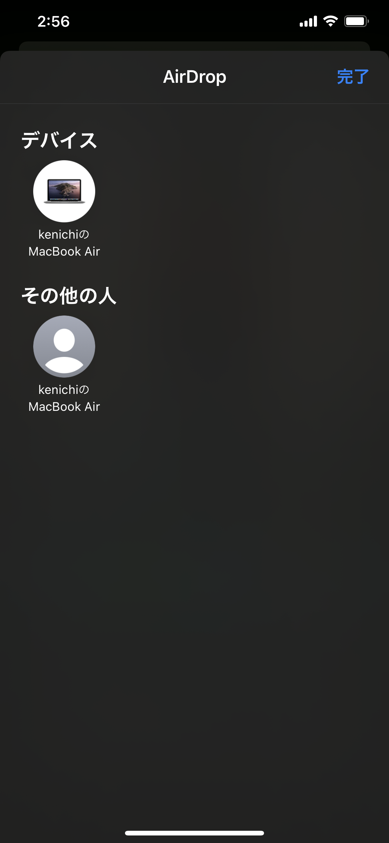 添付した画像のようにiPhone Xs Maxからmacbook air(M1チップ)にairdropで画像を転送しようとすると、いつの間にか同じデバイスが2つ表示されるようになってしまい、元々転送できていたデバイス(macの画像アイコン表示の方)『kenichiの〜』を選択しても延々に待機中のままになり、mac側でもなんの反応ありませんし、共有されません。