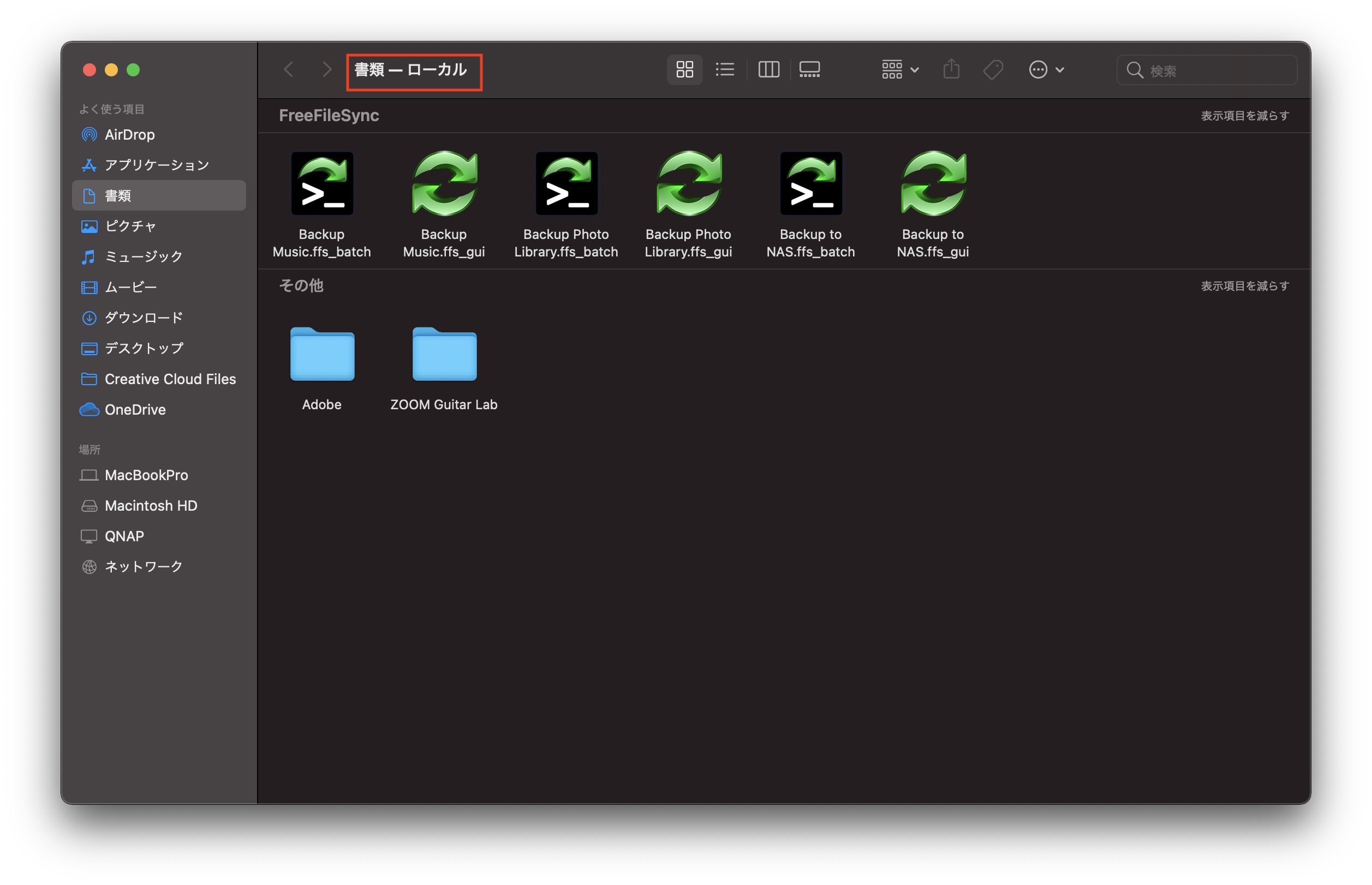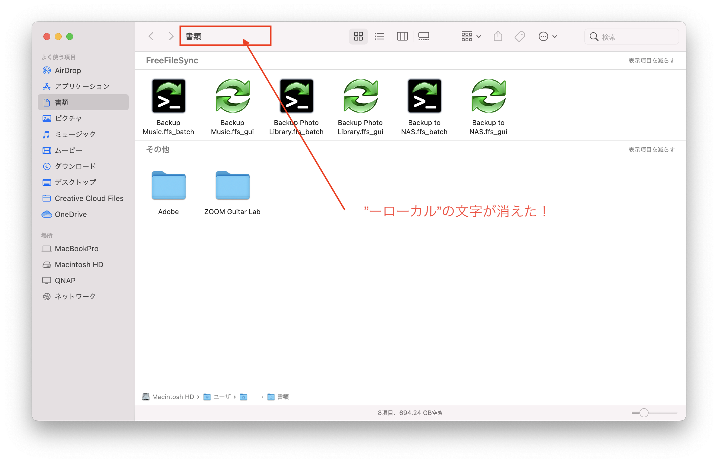 さらに、この設定変更を行ったMacだけでなく、同じApple IDでiCloudにサインインしている他のMacでも同様に、”デスクトップ”と”書類”フォルダのFinderウィンドウの表示に”ーローカル”の文字が表示され、消えないようになってしまいました。