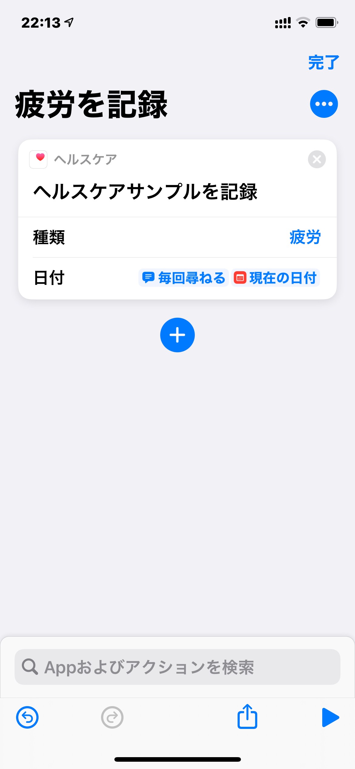任意のショートカットを押すと、ヘルスケアアプリの「疲労」項目を記録したい。