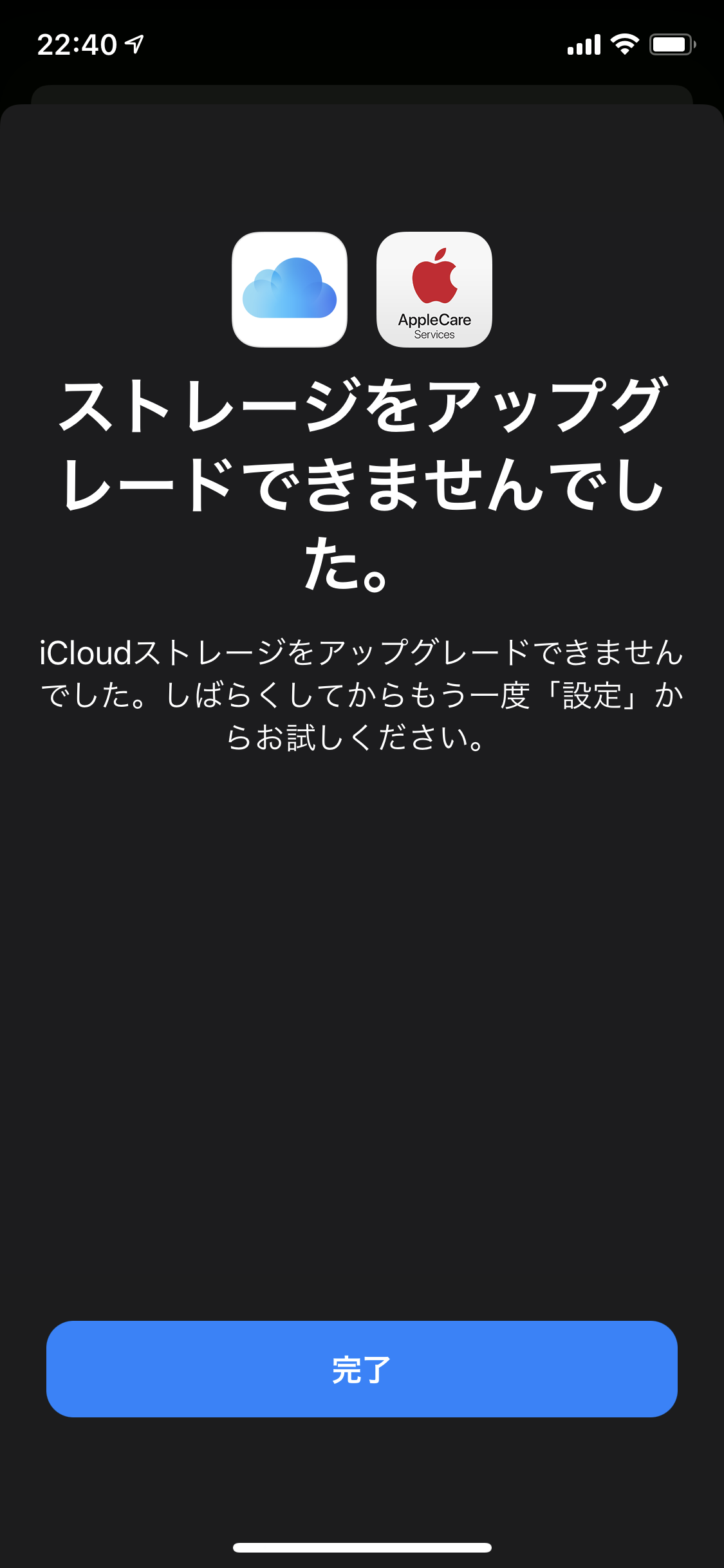 同じように設定で「!マーク icloudストレージを有効にする」、クリックすると「ストレージをアップグレード出来ませんでした。」と