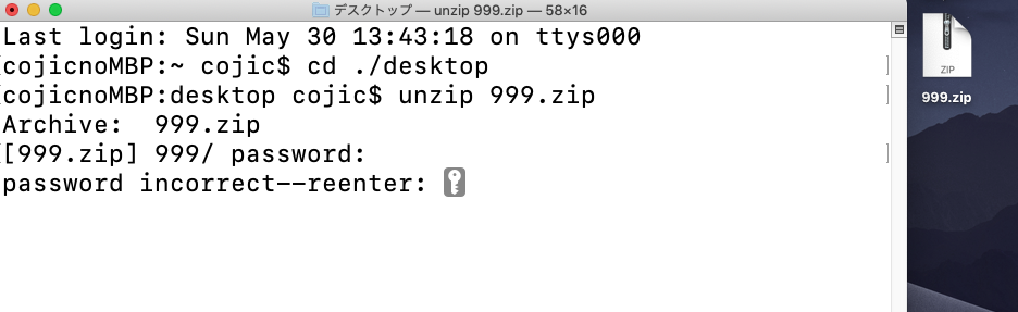 間違っているんですね...ひとつ不思議なのはunzip コマンド入力時に要求されるパスワードの1回目は通っている様に思えるのですが、、、