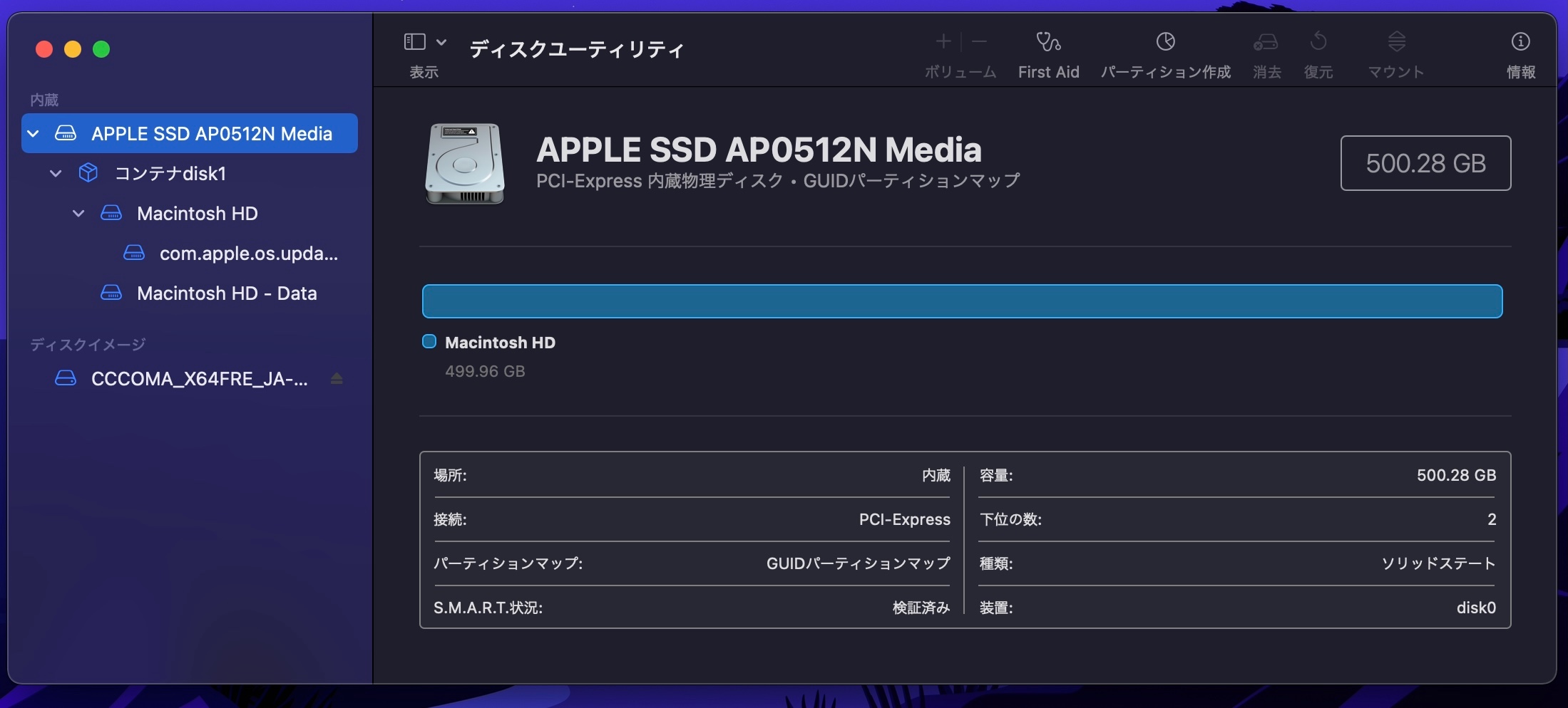 ディスクユーティリティの左欄に復旧ディスク本体(macOS Base Systemとかのもの)が見えないのですが。左欄に見えるCCCOMA_X64FRE_JA-...というのは何でしょうか?