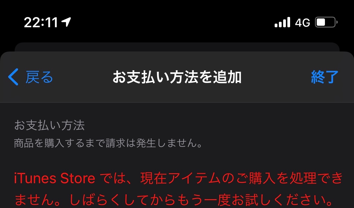 iTunes Storeでは、現在アイテムのご購入を処理できませんと表示される。