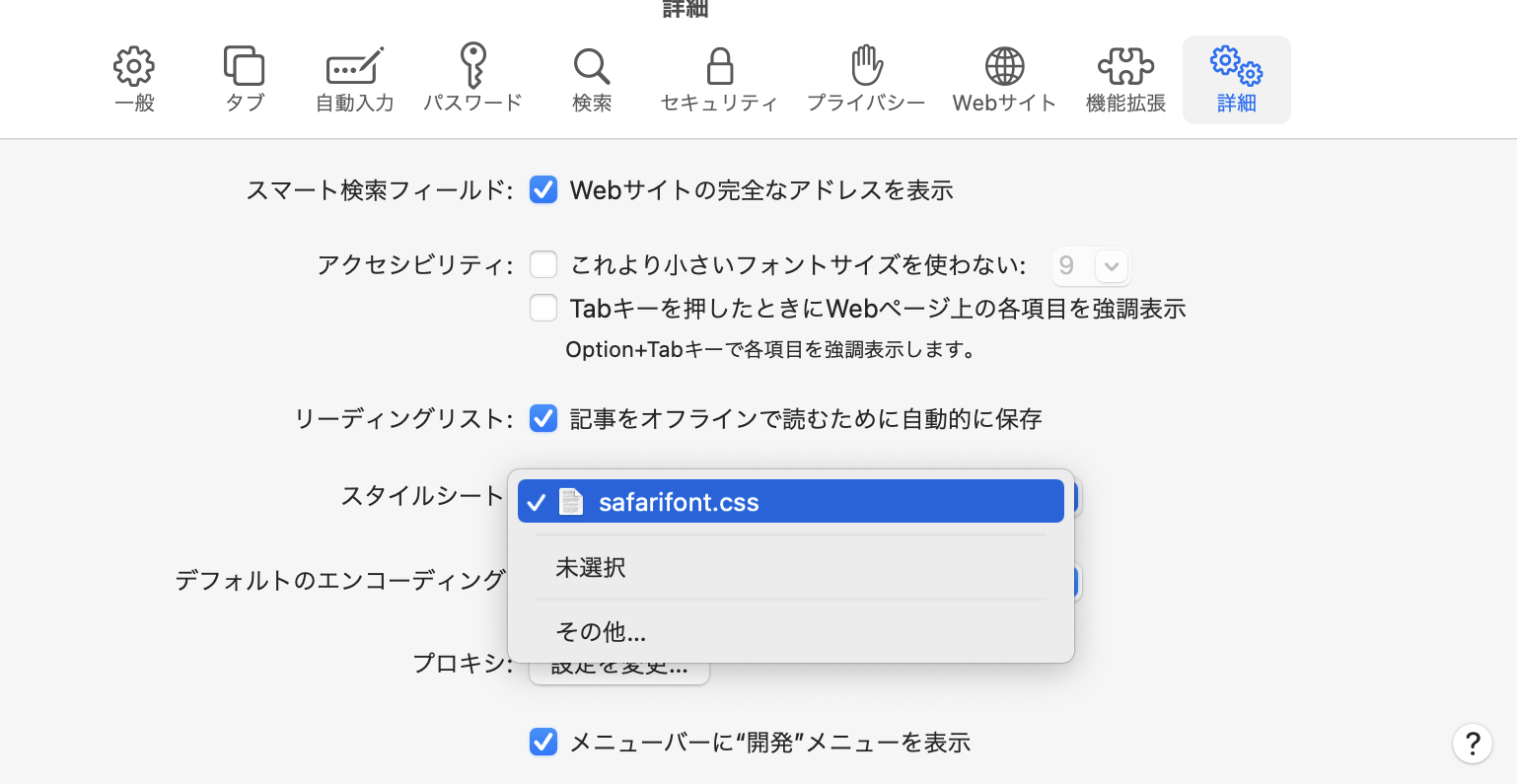 safariの「環境設定」→「詳細」→「スタイルシート」でフォントを変えるところまでは分かりました。