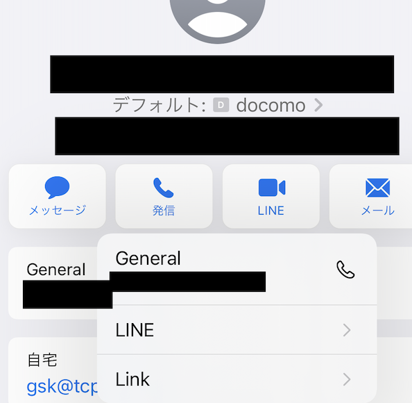 これをタップすると、General、LINE、Linkと表示されます。Generalをタップすればデフォールとの回線で電話、LINE、Linkをタップすれば(可能なら)それぞれで電話します。Linkをタップすれば、楽天リンクで電話になります。複数の電話番号を登録してる場合は、Linkをタップすると、それらの電話番号が表示され、選択できます。