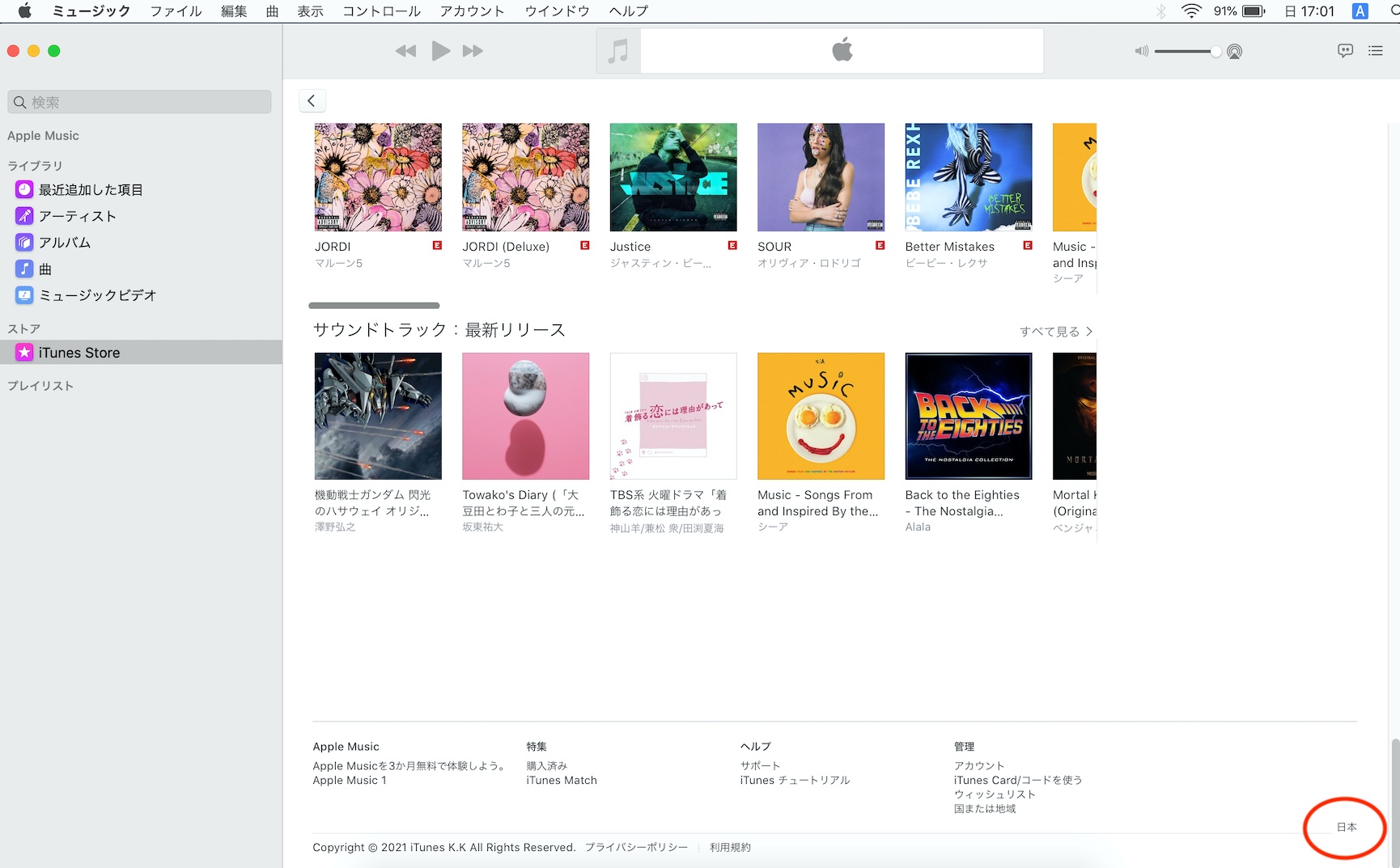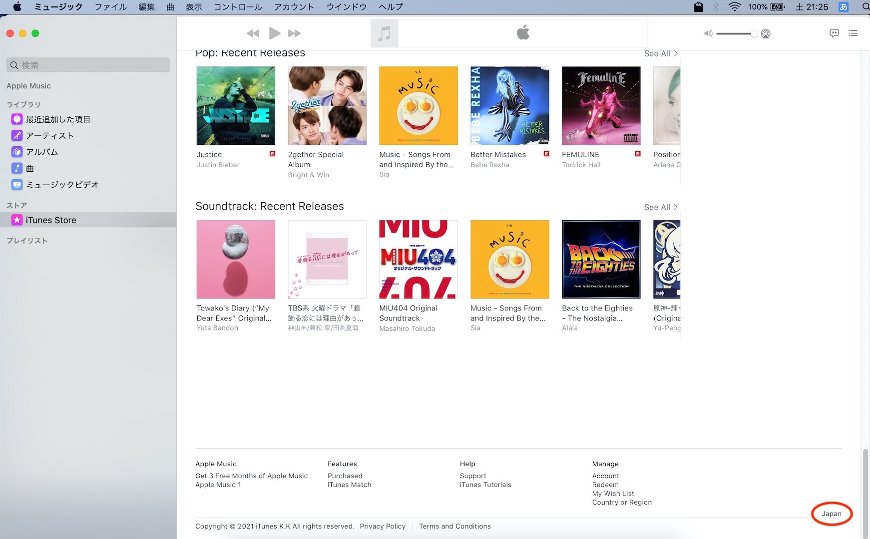 iTunesStoreが英語表記、国は日本を設定してあり、一番下までスクロールさせると国は"Japan"