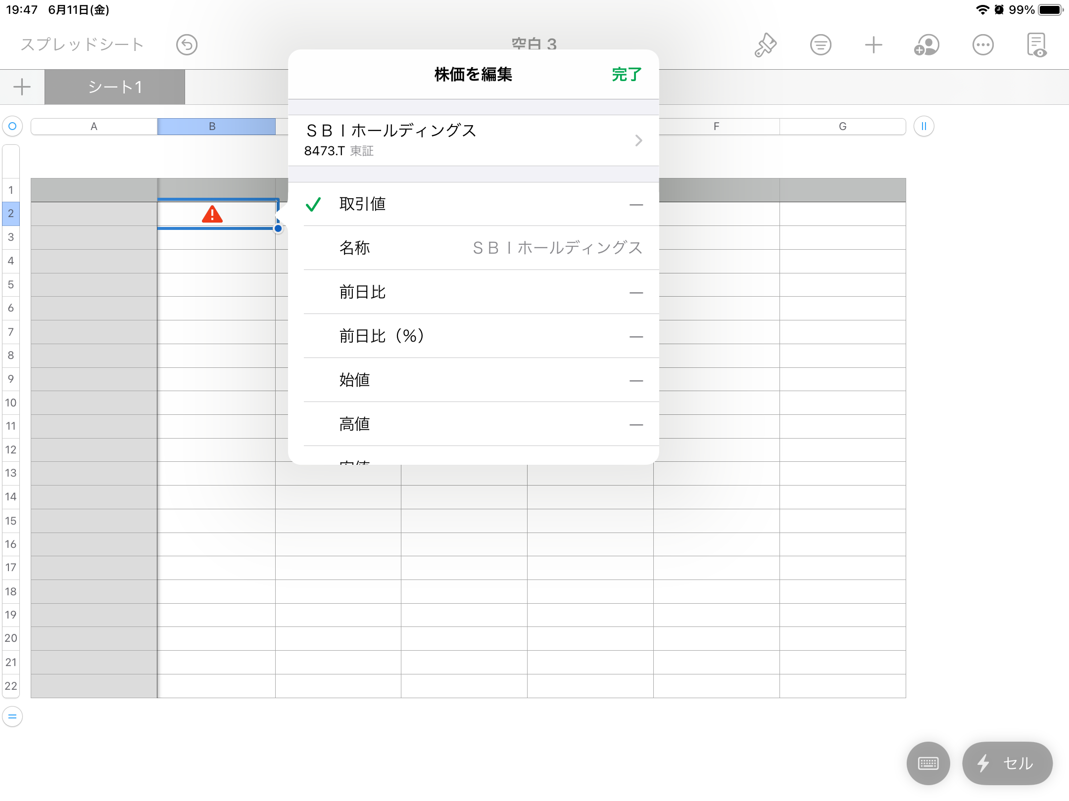 iPad の Numbers で株価情報が更新されず、スプレッドシートに追加することができない現象が発生しているということですね。