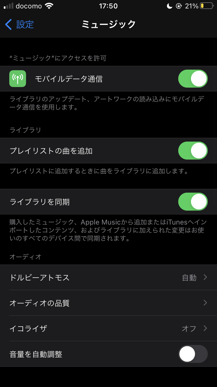最近、ライブラリに追加してあるだけでダウンロードしていない曲がWi-Fiに繋いでいる時以外にも再生されてしまうようになりました。1枚目の画像のように設定しているのですが、2枚目のモバイルデータ通信もオフにしないといけないのでしょうか?