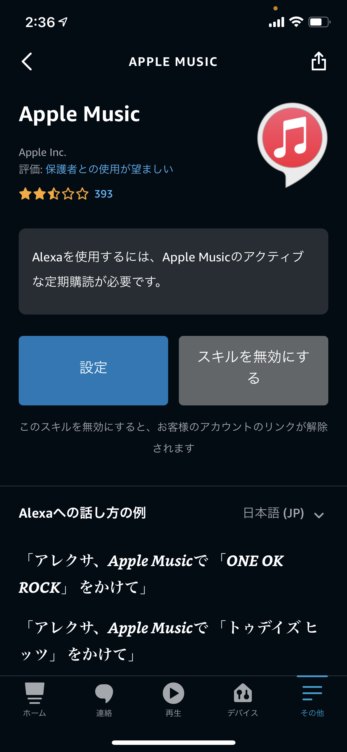 Amazon AlexaでApple Musicを掛けたく設定を済ませたのですが、画面の様に、『Alexaを使用するには、Apple Musicのアクティブな定期購読が必要です。 』となります。