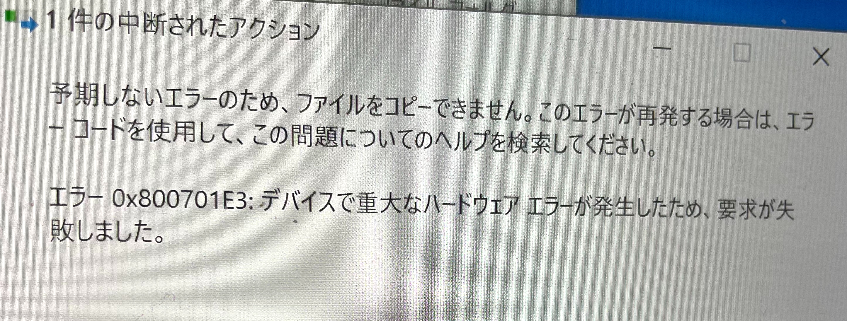具体的な症状としてはwindowsにてファイルを開こうとしても重大なエラーと表示され開けなかったり、他の外付けHDDにデータを移そうとしてもエラーとなり取り出すこともできません。