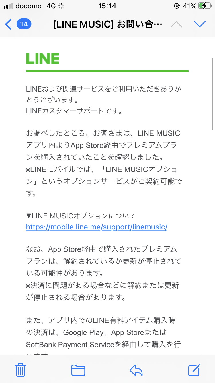 ラインミュージックが使用できなくなり問い合わせたところ、写真のようにApple Store経由でのLINEミュージックのプレミアムプランが解約、契約停止させている可能性があるとのことでしたので問い合わせをしました。
