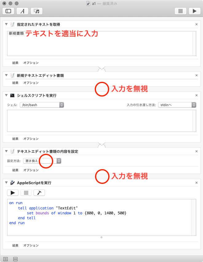 Mojave 環境下の Automator では「新規テキストエディット書類」アクションに何も入力がないとエラーとなります。
