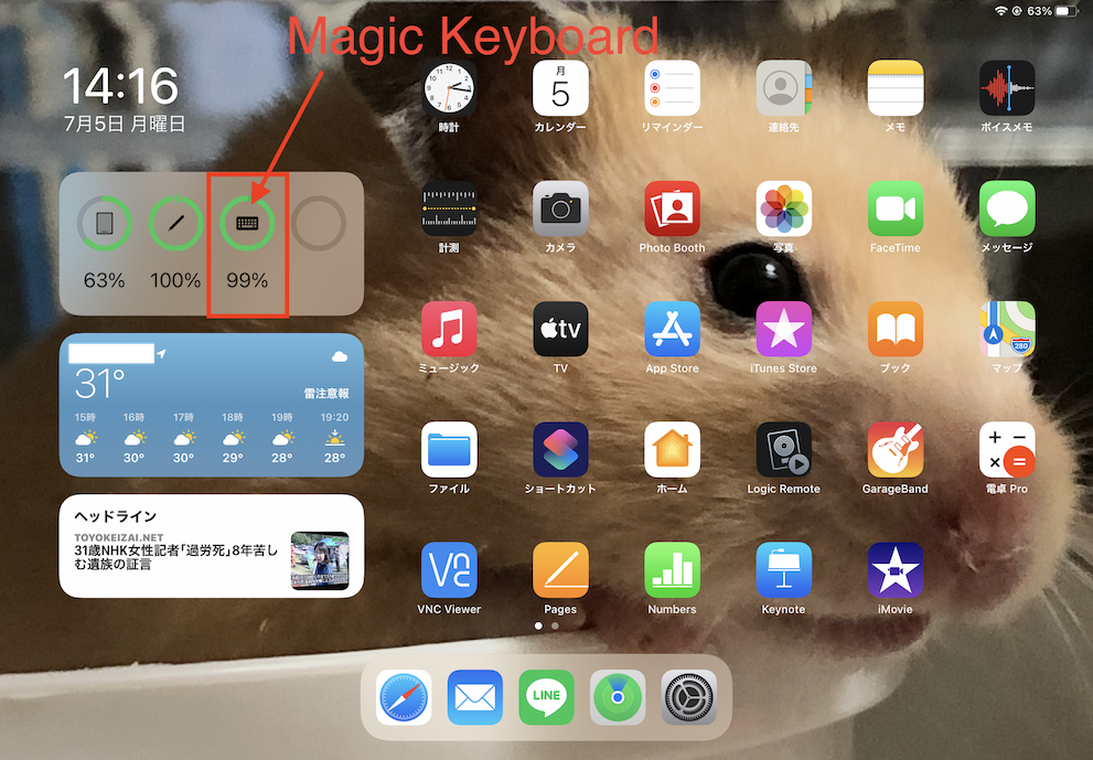 バッテリーウィジェットにMagic Keyboardのバッテリー残量が表示されています。