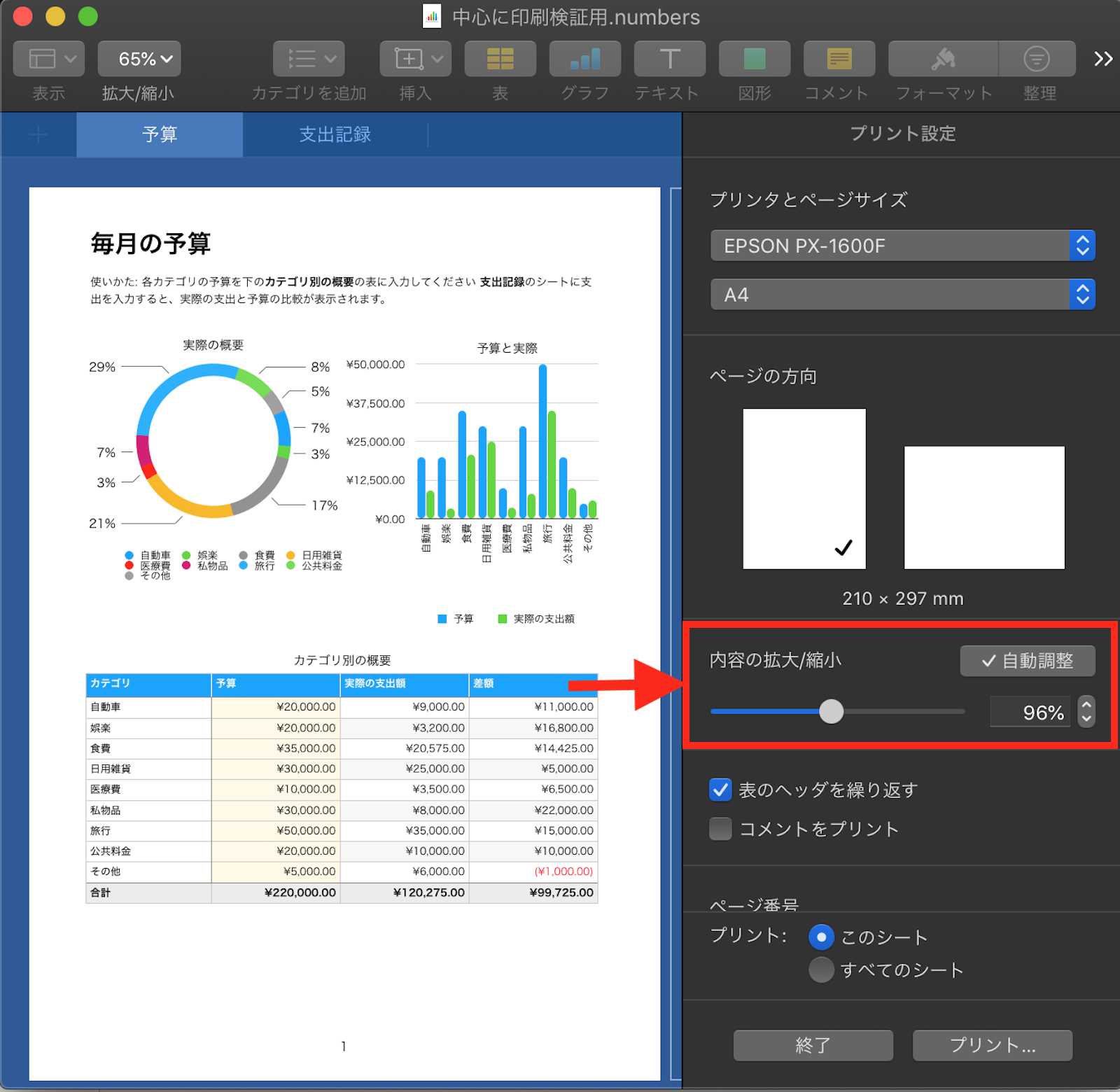 まず、下の画像の様に「command」+「P」キーで「プリント設定」画面を表示させ、「自動調整」ボタンをクリックするか、「拡大/縮小」ゲージで用紙の左右方向の中心に収まる様に調整して下さい。