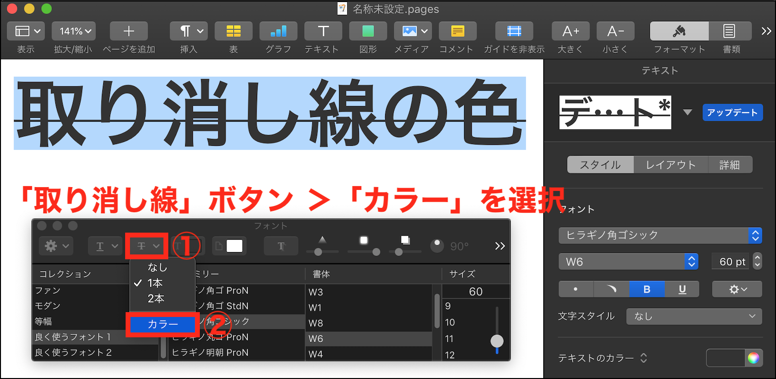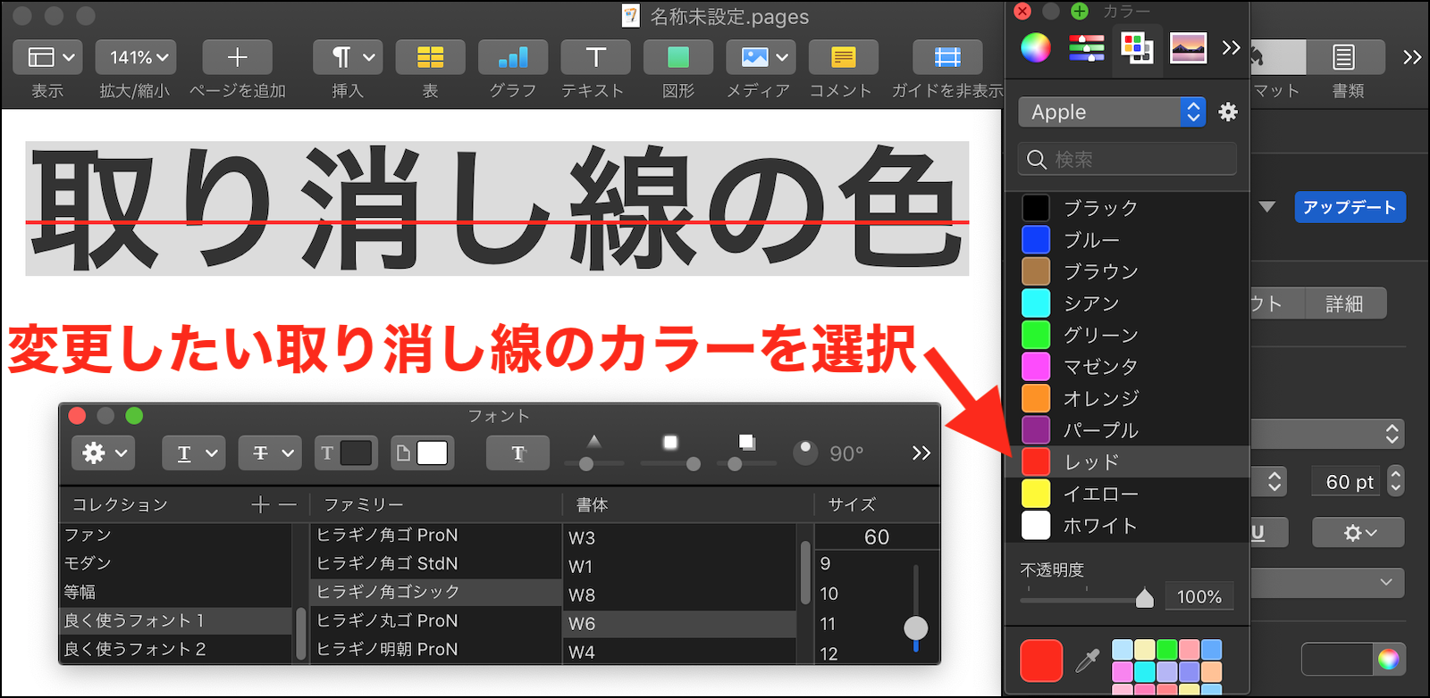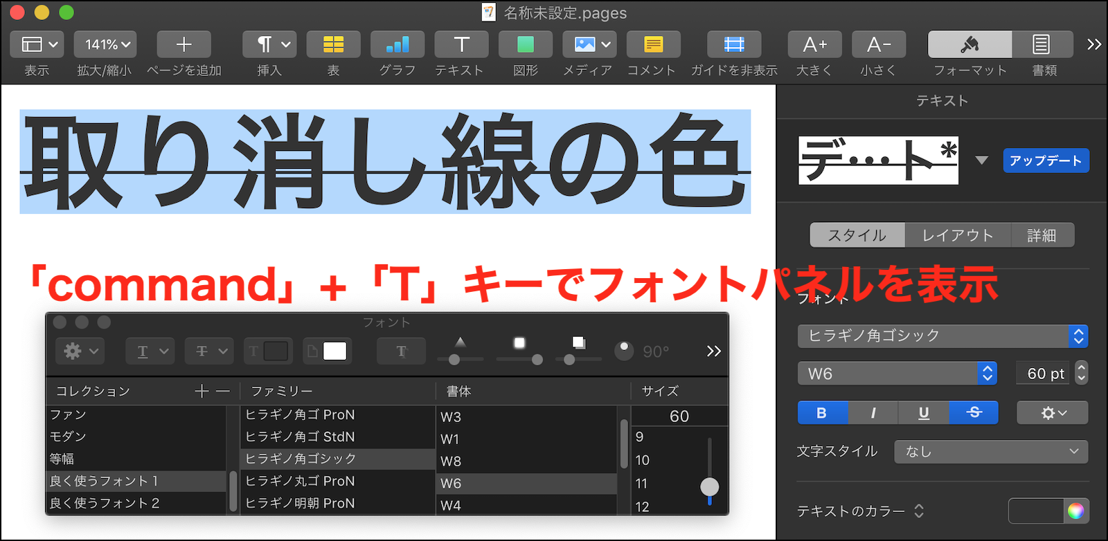 下の画像の様に、取り消し線のカラーを変更したい部分を選択状態にして、「command」+「T」キーでフォントパネルを表示させます。